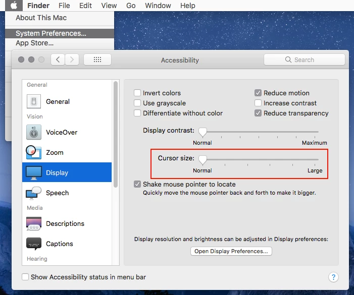 Go to System Preferences>Accessibility>Display and set the Cursor size to Normal.