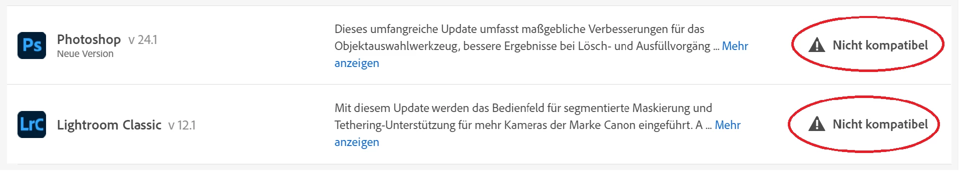 "nicht kompatibel" wenn ich da drauf klicke wird angezeigt "Aktualisierung erforderlich