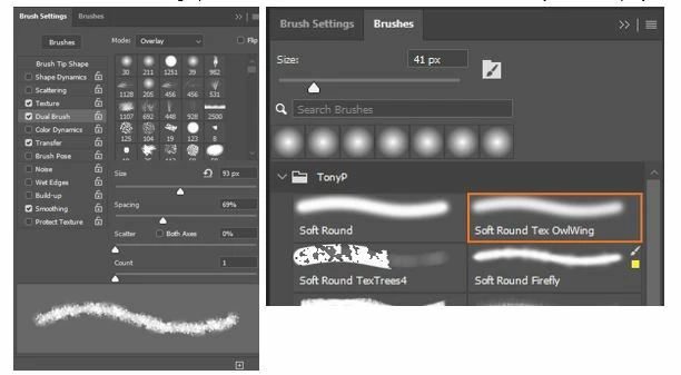 In the Brush Settings panel, Dual Brush is activated. I selected the Soft Round as my first brush. I can select any brush displayed in the Brush Settings panel as the second brush. However, the brush I want for a second brush is the Soft Round Tex OwlWing brush, which is a custom brush preset displayed at right in the Brushes panel. This custom brush does not show in the Brush Settings panel; so I can’t select it as the second brush of the Dual Brush set. Does anyone know how to get that custom brush to show in the Brush Settings panel so that I can select it as the second brush?
