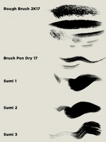 but when i use them on photoshop cc there is no texture and barely any dynamic to them (here i used rough brush 2k17 and sumi 3) :