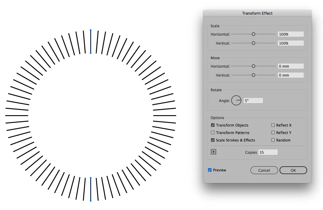 Now I KNOW that it repeats the last transform, so if you moved it immediately prior to doing the initial copy with CMD+OPT+T, then it will 'bake' that translation in. But I've closed Photoshop, re-opened it, had my 'tick' mark line vertical at zero degrees around my circle, then used CMD+OPT+T to duplicate it, then drag the anchor back down to the centre of the screen (setting it at exactly 1024.0 by 1024.0 = my image is 2048 by 2048) and then typing in the rotation angle I want, and then clicking the Tick to confirm the transform. And the press CMD+OPT+SHIFT+T without EVER changing the transform in-between, and it STILL spirals away from the centre!