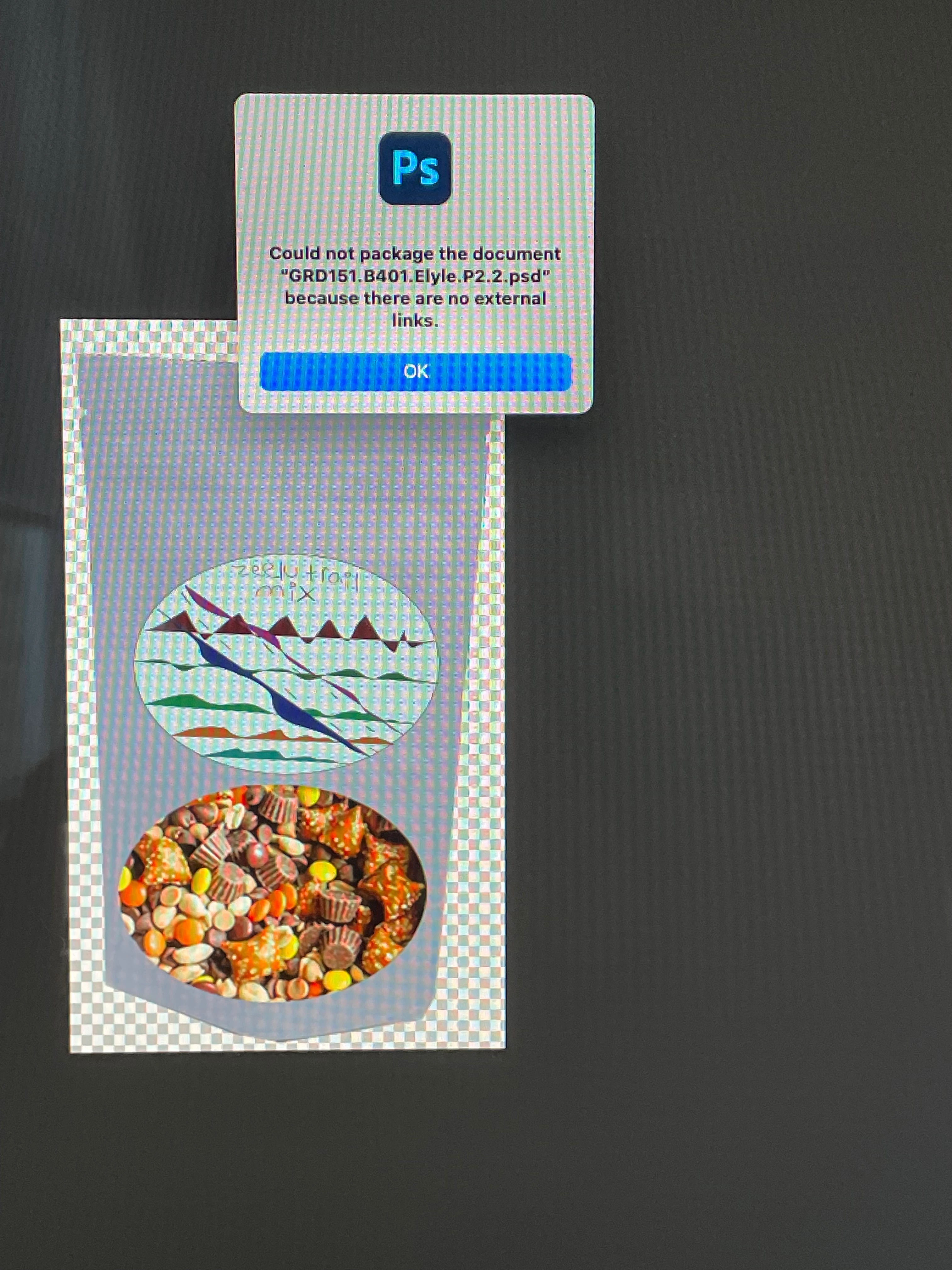 Elyle003CpccParticipantForum|Forum|3 years agoNovember 17, 2022QuestionProblem with saving with photoshopForum|Forum|3 years agoNovember 17, 20221 reply758 viewsI trying to package my document from photoshop to a file and it is saying "could not package the document “GRD151.B401.Elyle.P2.2.psd” because there are no external links." What do I do and How do I package if this is the issuemacOS
