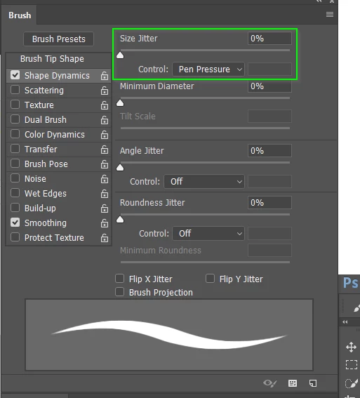 Well when I tried to use any brushes I noticed that there was no difference in opacity or size with my brush, after trying out some things I saw online and watching some videos I finally got opacity to work... but not size. In the Shape dynamics section in the "Brush" window i noticed a lot of people talking about changing the setting but i just cant; everything is grayed out and cannot be changed. I'm not sure why opacity is working but size isn't, it doesn't make much sense in my opinion but hey i'm not super tech savvy.