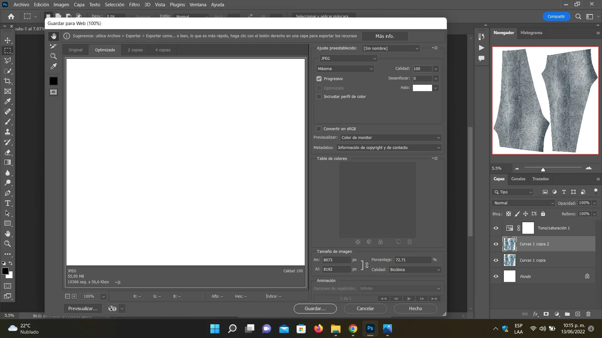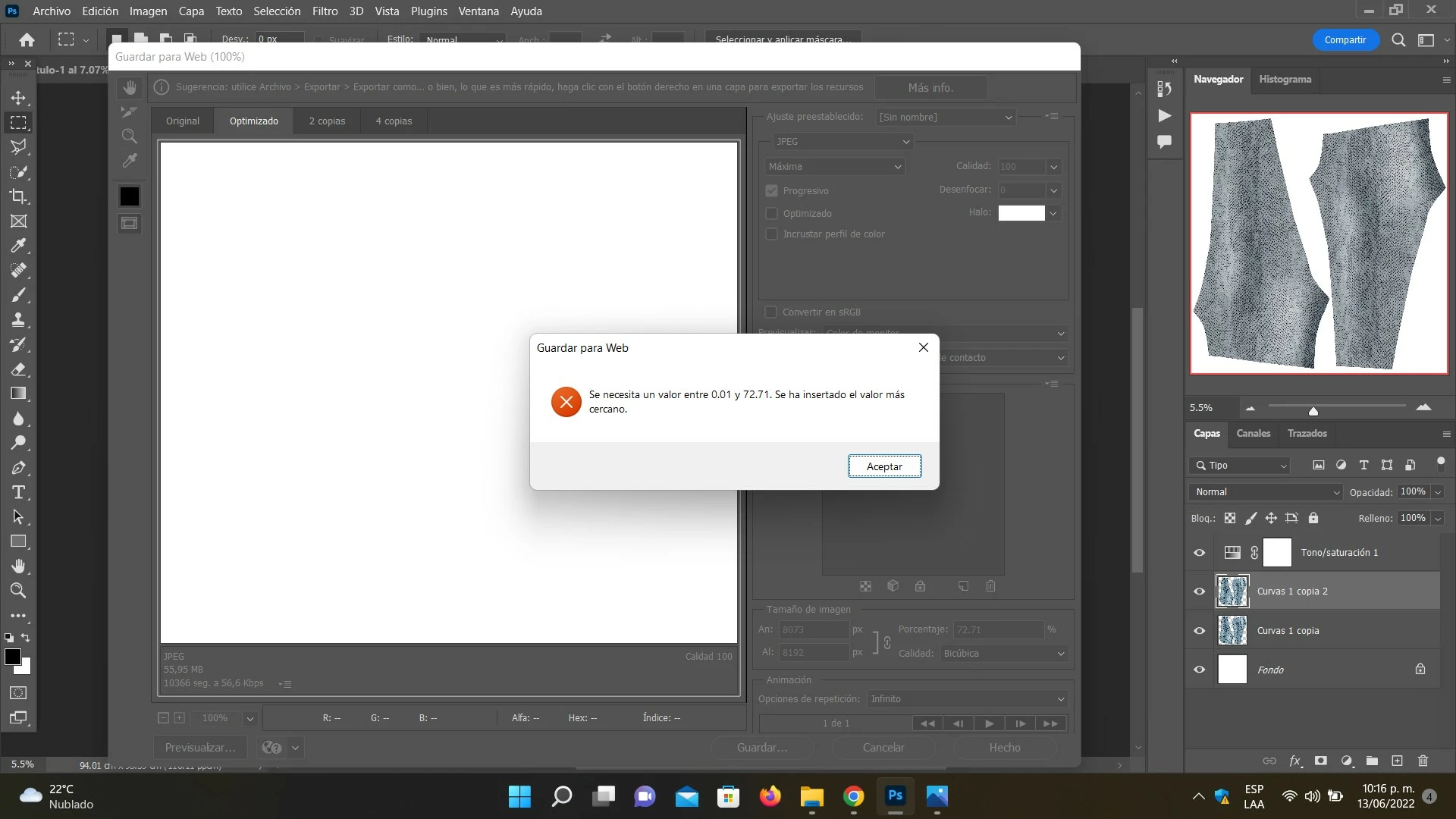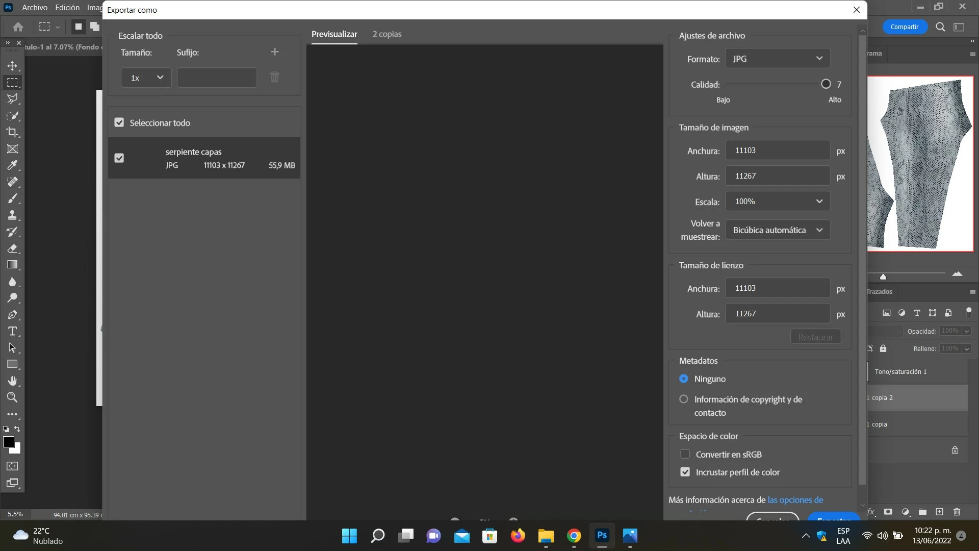 al exportar o guardar cualquier imagen en jpg. se cambia de tamaño, una imagen de 50x50 se convierte en 66x66 cm ya intente todo y no puedo corregirlo
