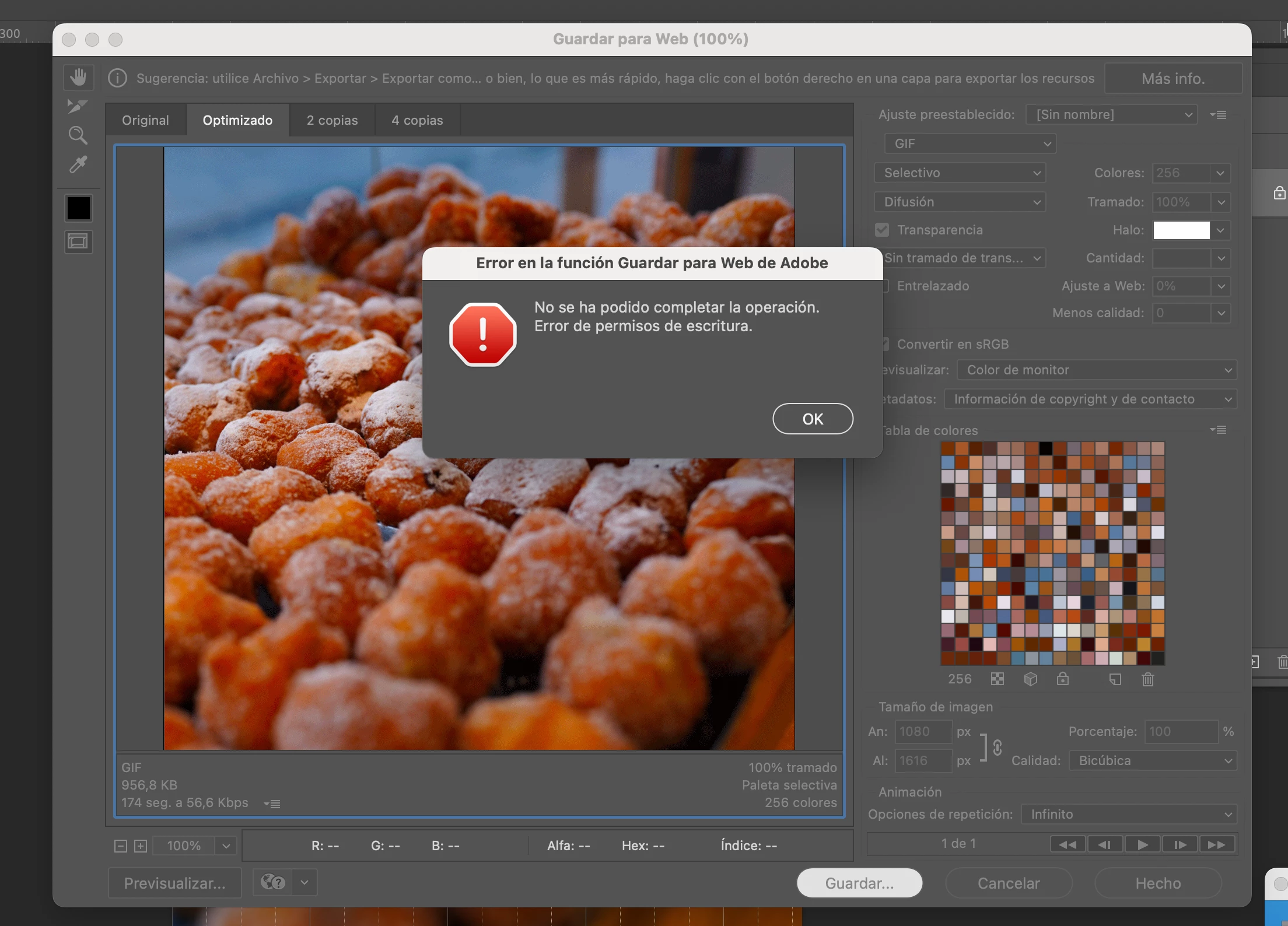 "Error en la función de Guardar para Web de Adobe