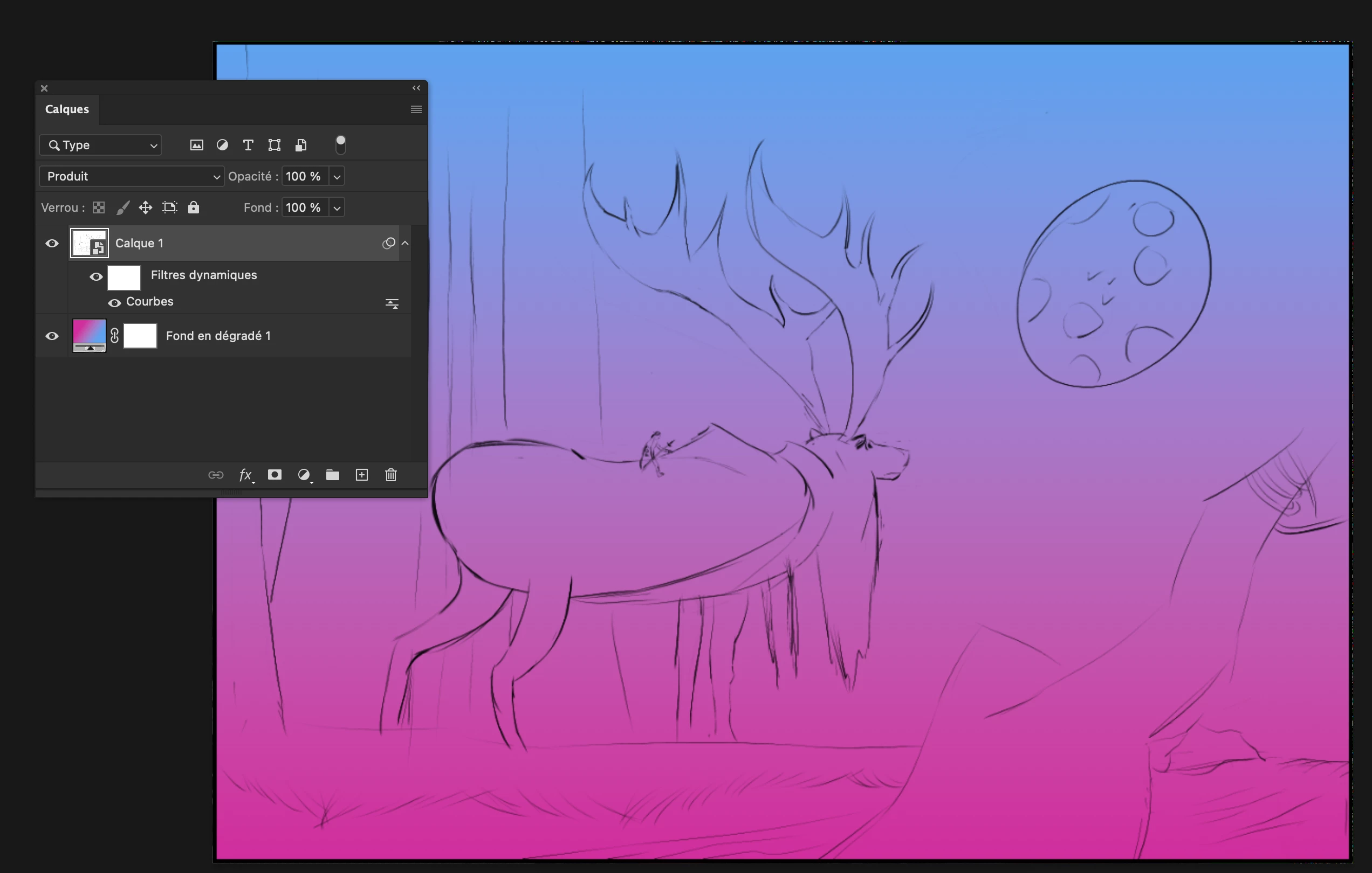 En dessous on place le dégradé. Le calque du croquis est en mode produit.