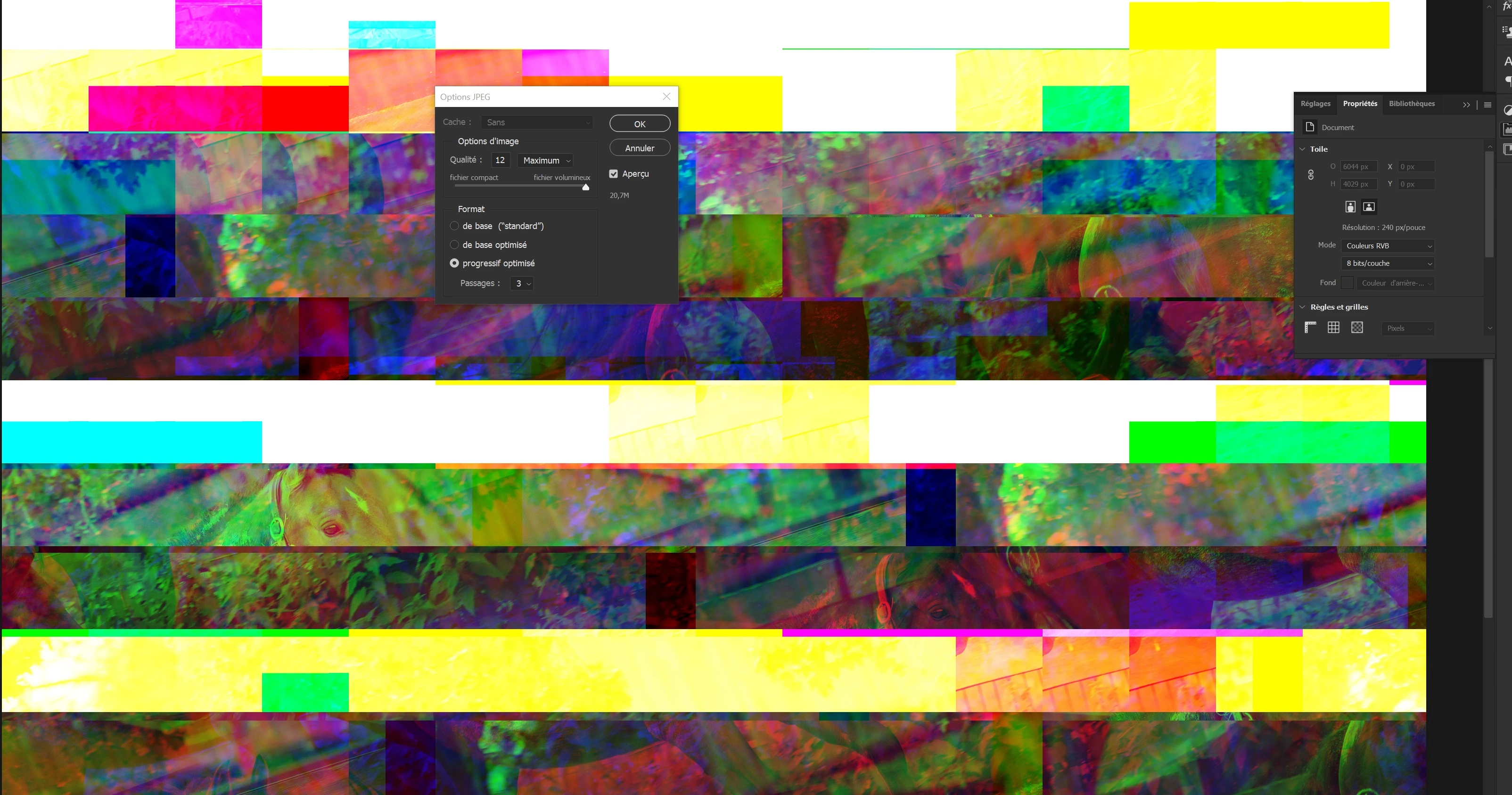 Bonjour , je ne comprend pas pourquoi je ne peux plus enregistrer correctement mes photos en jpg, je ne connais pas le mot technique pour ce probleme mais l'image est casse avec melange de couleur,
