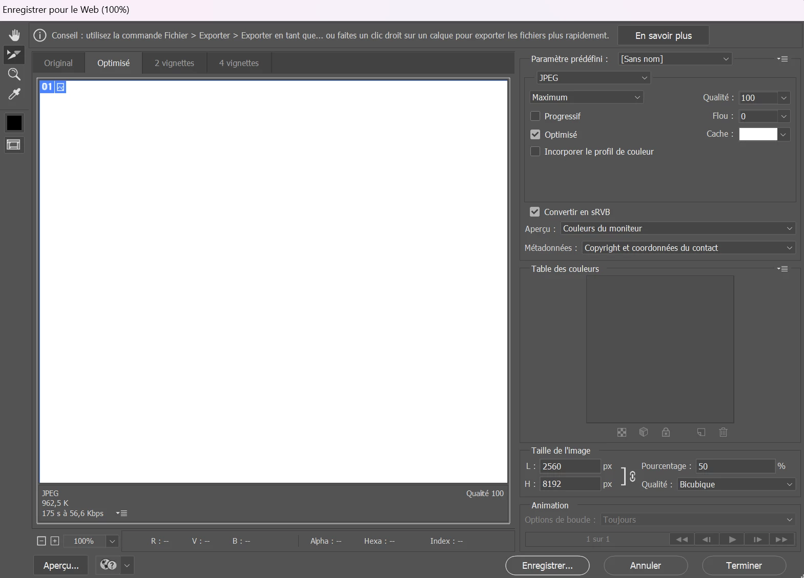 Photoshop m'oblige à réduire cette taille à 50%. Quand j'essaie de passer à 100 %, voilà le message qui s'affiche.