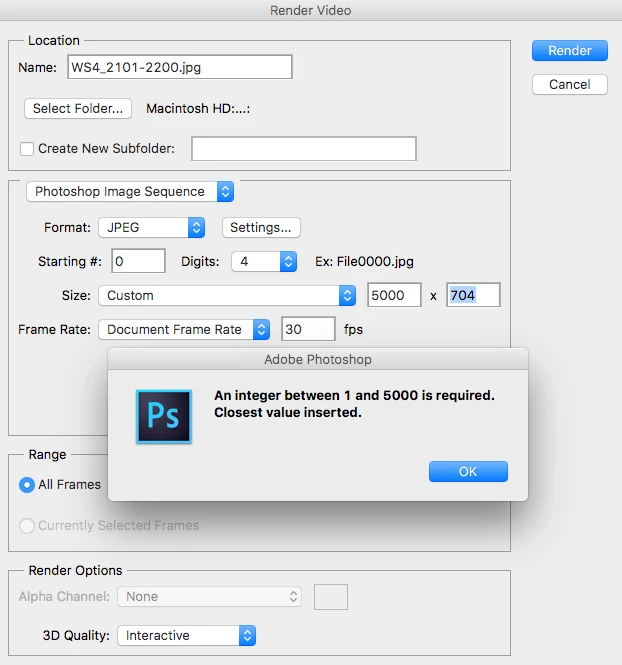 I'm trying to export an animation I created in timeline as an image sequence using the File > Export > Render Video > Photoshop Image Sequence method but I've come across a problem.