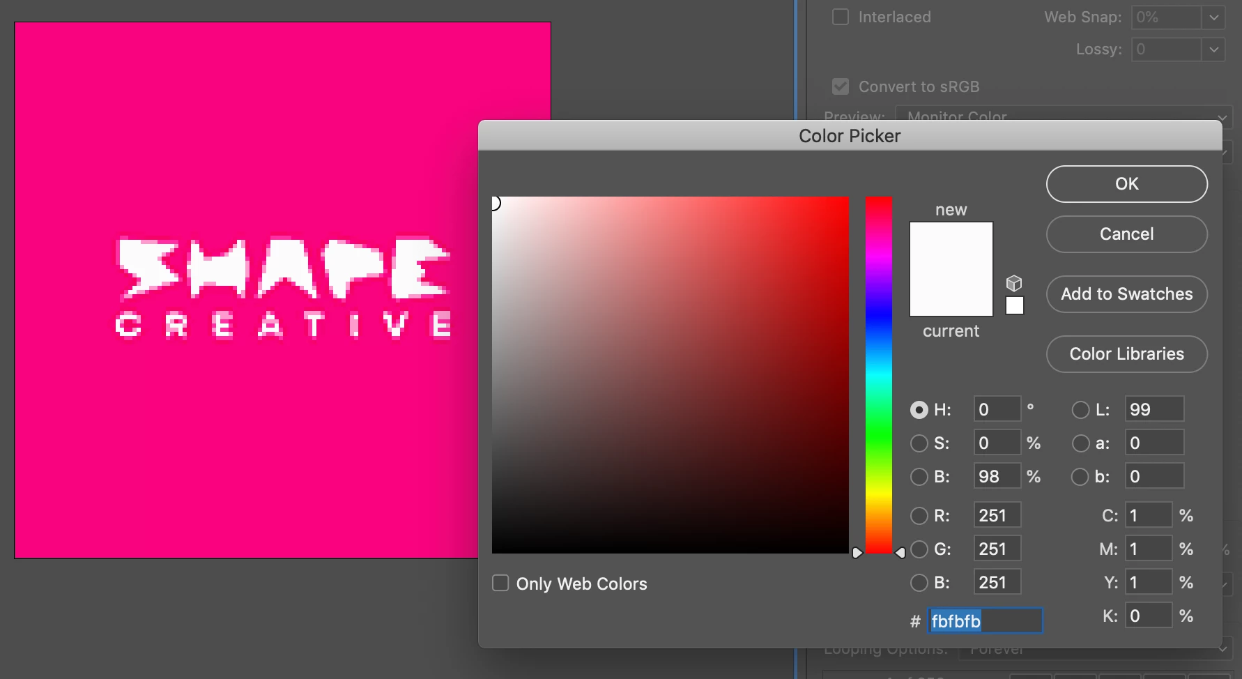 If I try to change the colour (in the 'save for web' dialogue by clicking the color and double clickng the swatch), it changes in the colour dialouge, but when I reopen the swatch to check it's gone back to #fbfbfb.