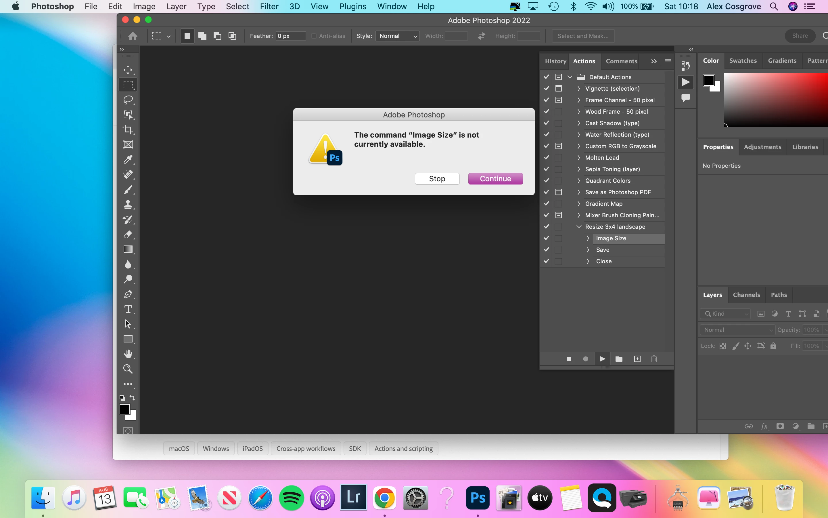 I created an action to resize the image and have tested it to check it works on a single file but then when I try and change file size using the automate function I get a pop up saying image size is not available, save is not available, close is not available.