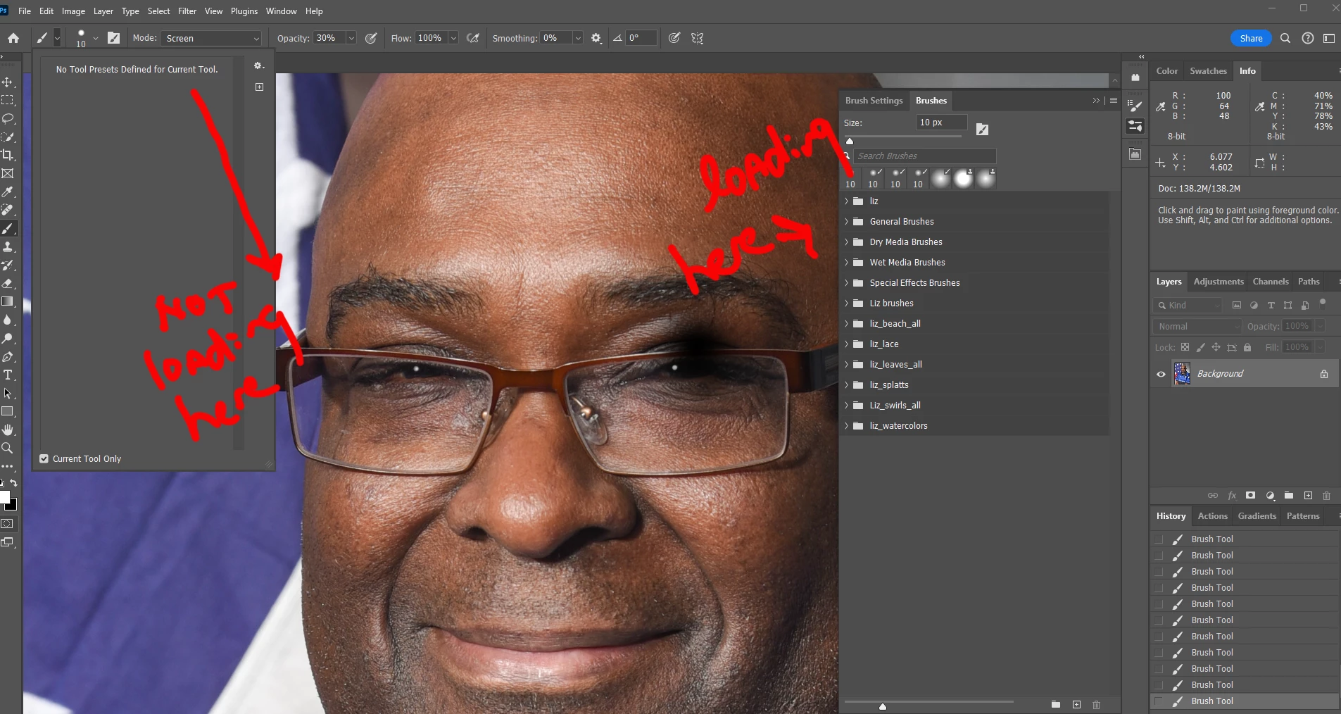 I am on Photoshop 25.9.1 Windows 11. My old laptop crashed so I had to purchase a new one and I'm desperately trying to get everything loaded again so I can get back to work. I have no access to any brushes, etc. Plus, I have old .tpl files and .abr, etc files kept in a main file that I just access to load. I call it "liz's big Photoshop presets". I've got it located in my pictures. I can import those via the brushes window on the right, but I can't get anything to load where I have always accessed my brushes on the left (see uploaded screenshot). Where are the tools that come with photoshop and why can't I use my brushes, etc. on the left.