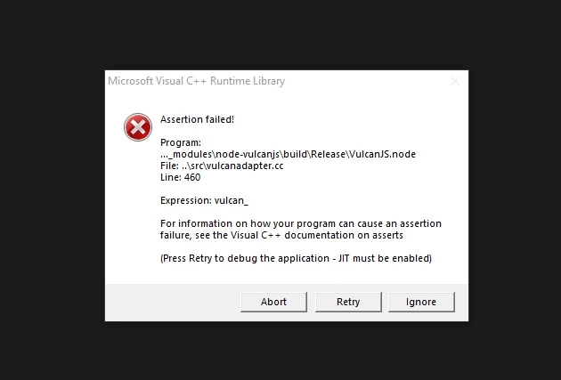 "Program: ..._modules\node-vulcanjs\build\Release\VulcanJS.Node File:...\src\vulcanapter.cc