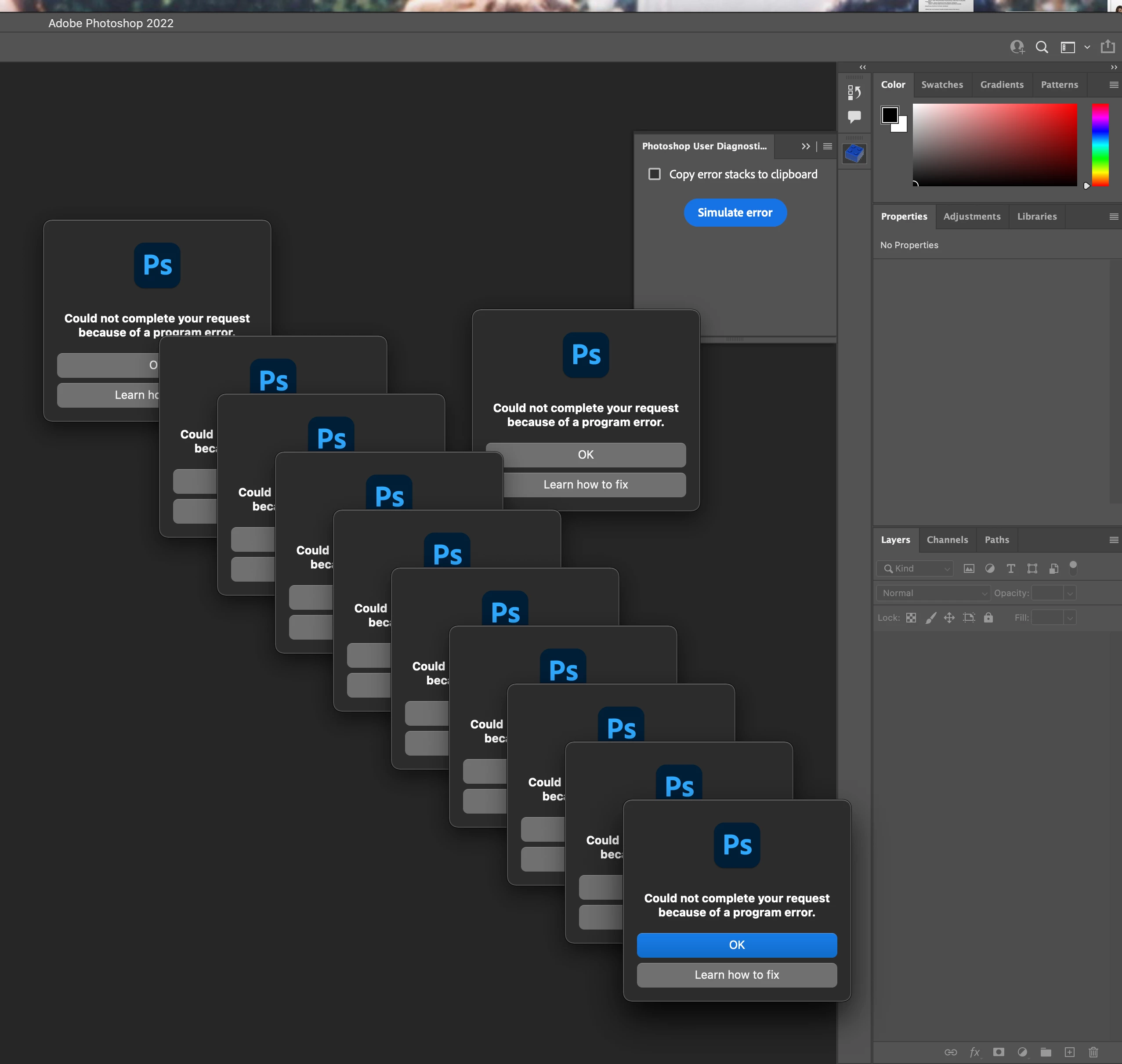 Basically, if I try opening the Photoshop Preferences panel, it opens up for half a second before giving me the error "Could not complete your request because of a program error", so it is impossible to change my settings outside of doing the reset preferences shortcut (which I have tried). Occasionally, the error will pop up by itself umprompted as well and every time "Ok" is selected, dozens of new error windows pop up.