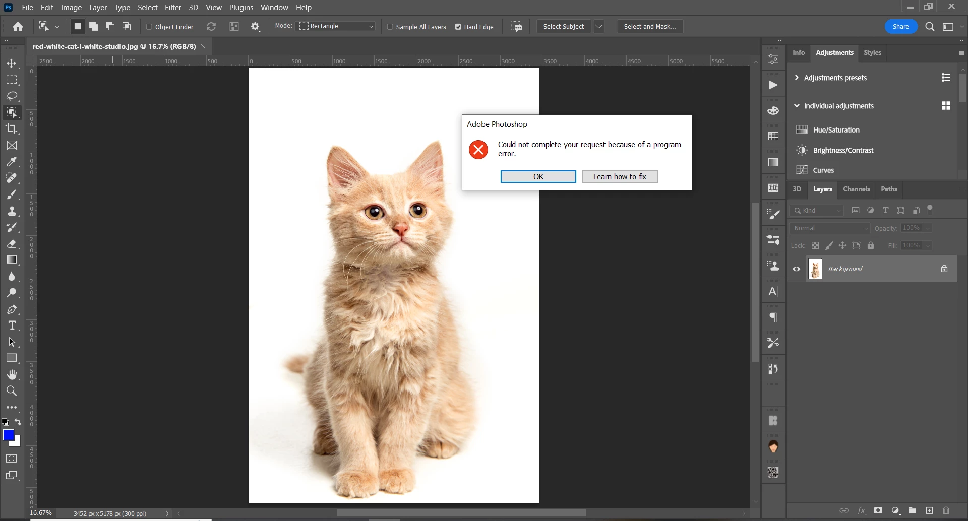I've been trying to select some objects in different photos. Still, when I try to make the selection using the Object Selection tool, I get the message "Could not complete your request because of a program error." Even if I click on the select subject button the selection is done without any problem, the message appears only when I try to make the selection using the mouse.
