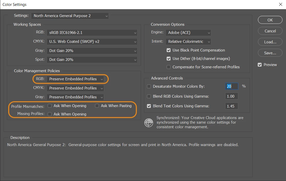 • If Photoshop asks you to manage the color space when you open a new document with a different color profile than that of your Photoshop, you can uncheck the 'Ask when opening' option. This will make Photoshop go by the policy you have set above to handle RGB documents.