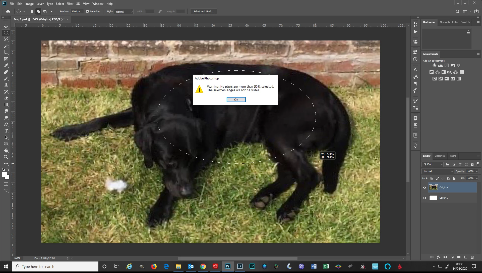 I have just updated to 21.1.2 (automatic update) since when selecting the eliptical marquee tool generates a Warniing msg. - "No pixels are more than 50% selected. The selection edges will not be visible".