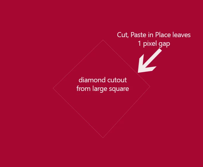 Hello, when I use any of the marquee or lasso tools to cut a section of an image then "paste in place" the extracted section leaves a 1-pixel gap. I would expect the two sections to be seamless. In the image below I simply used the polygonal tool (happens with all marquee and lasso tools) to cut out a diamond shape from the square and then use PASTE SPECIAL > Paste In Place. As you can see there is a 1-pixel gap. I would expect it to be seamless. Is this a known problem or perhaps a setting that I need to enable? By the way, my display settings are 1920x1080 on 25" monitor desktop.