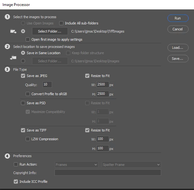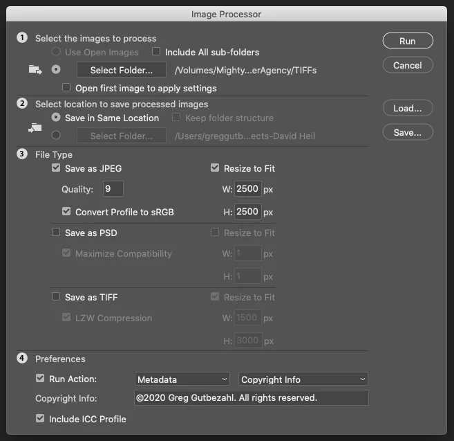 After completing many hours of retouching and saving 72 images as 6200px TIFFs, went to Image Processor to batch process the images to 2500px JPEGs. I went back to do some further edits to the TIFFs, only to find that Image Processor had ALSO resized all of the TIFFs. The settings were clear — JPEG was the only file type to be batch resized and saved. I can't go back as magically nring the TIFFs back to their original sizes, so I'm going to have to do all of the many hours of retouching over again. Screenshot of settings is below. It seems this is just one more bug with the recent rush of updates, to add to the long list of bizarre things Photoshop is now doing.