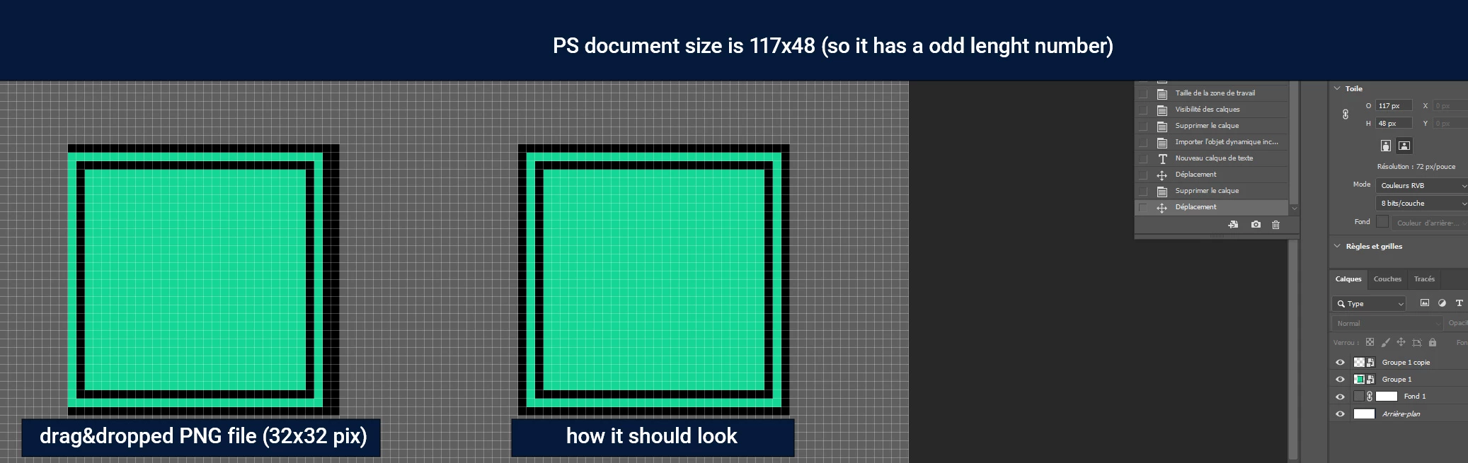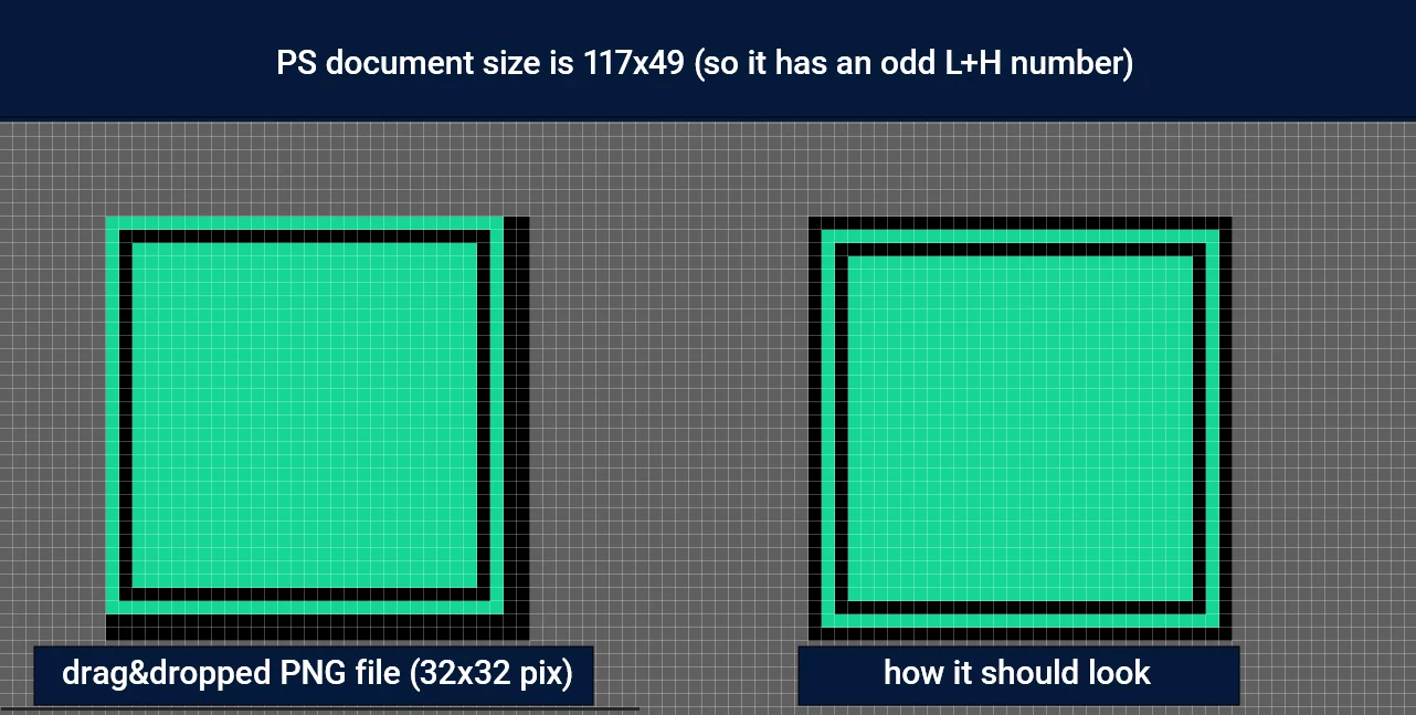- import an asset with EVEN numbers (png or jpg, for ex 32x32) with a drag and drop into the document. This create smartobject layers but the display is offset by 1 pixel.