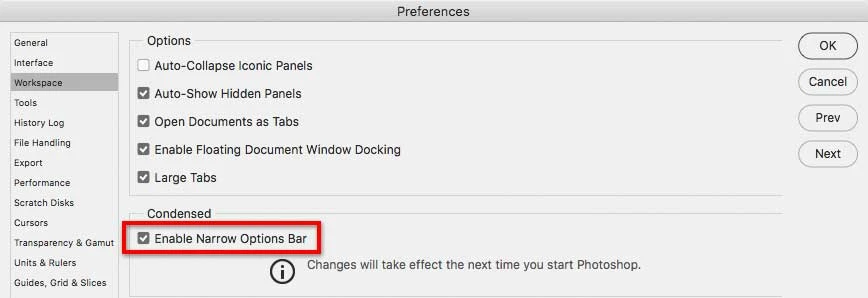 (Photoshop CC>Preferences>Tools>Enable Narrow Options Bar)