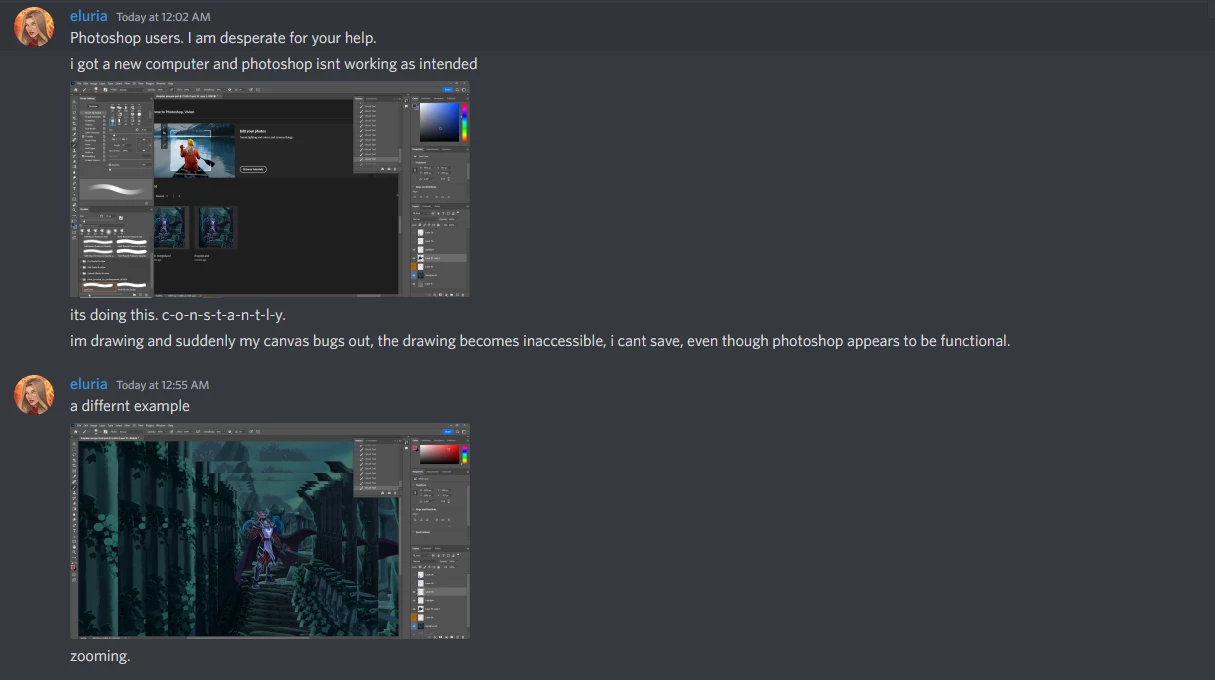 To give context, I have been working on commissions on my old, but very strong computer up until a few days ago. The program would work flawlessly for the most part, except, the working canvas would, from time to time, bug out - usually indicated by the scrollbar just falling down but visually I would have been locked into the same part of the canvas where I was zoomed in originally. A very annoying bug for sure but I never really had to lose work over it, simply saving with Ctrl+S would overwrite the old document to the newest one, after which I could just close the file and open it again and it would be ready for me to work again - no progress lost whatsoever.