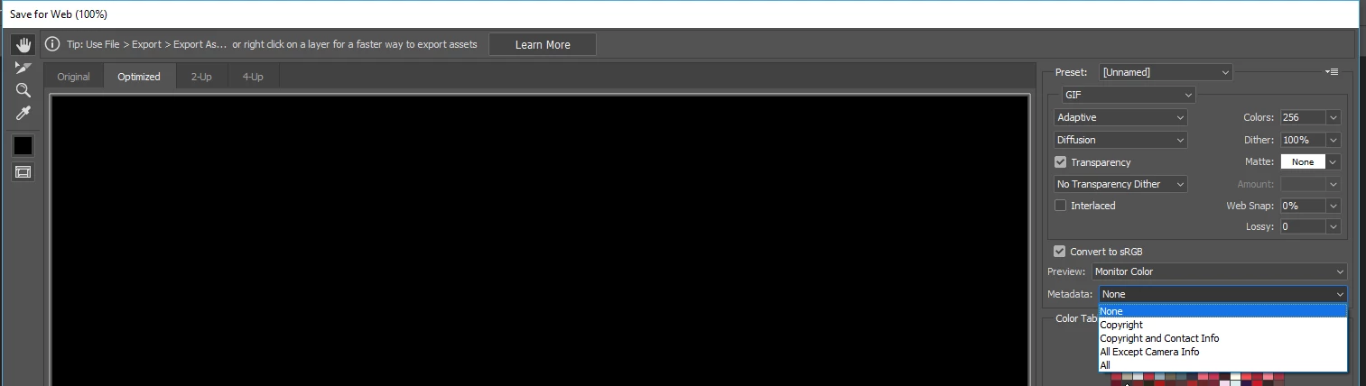 Now it populates the 'Copyright Notice', I go on to then create the 'Save for Web' action, in the settings dialogue for this i have 'Meta Data: All' selected.