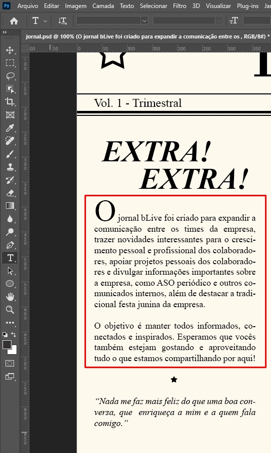 Infelizmente, não tenho como obter o InDesign agora. Por isso, tenho que usar o Photoshop pra tudo. Fiz um trabalhinho no Photoshop que era tipo montar um jornalzinho. Então criei os blocos de texto normal, as imagens, etc. Não é para impressão. Mas preciso que seja em PDF. Porém, quando salvo em PDF, parte do texto simplesmente some. Já tentei vários tipos de configuração de saída, já tentei usar "automatizar/apresentação de PDF", nada funciona. No photoshop o texto aparece corretamente e quando salva em PDF uma linha do texto não aparece.