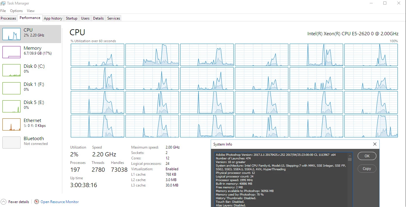 I was having a problem with the shake reduction filter and I found that only one core was being used which was running at 100% while the others were hardly working. When I restarted PS, the work was spread across all the cores. But, next time it started back to the one core problem!