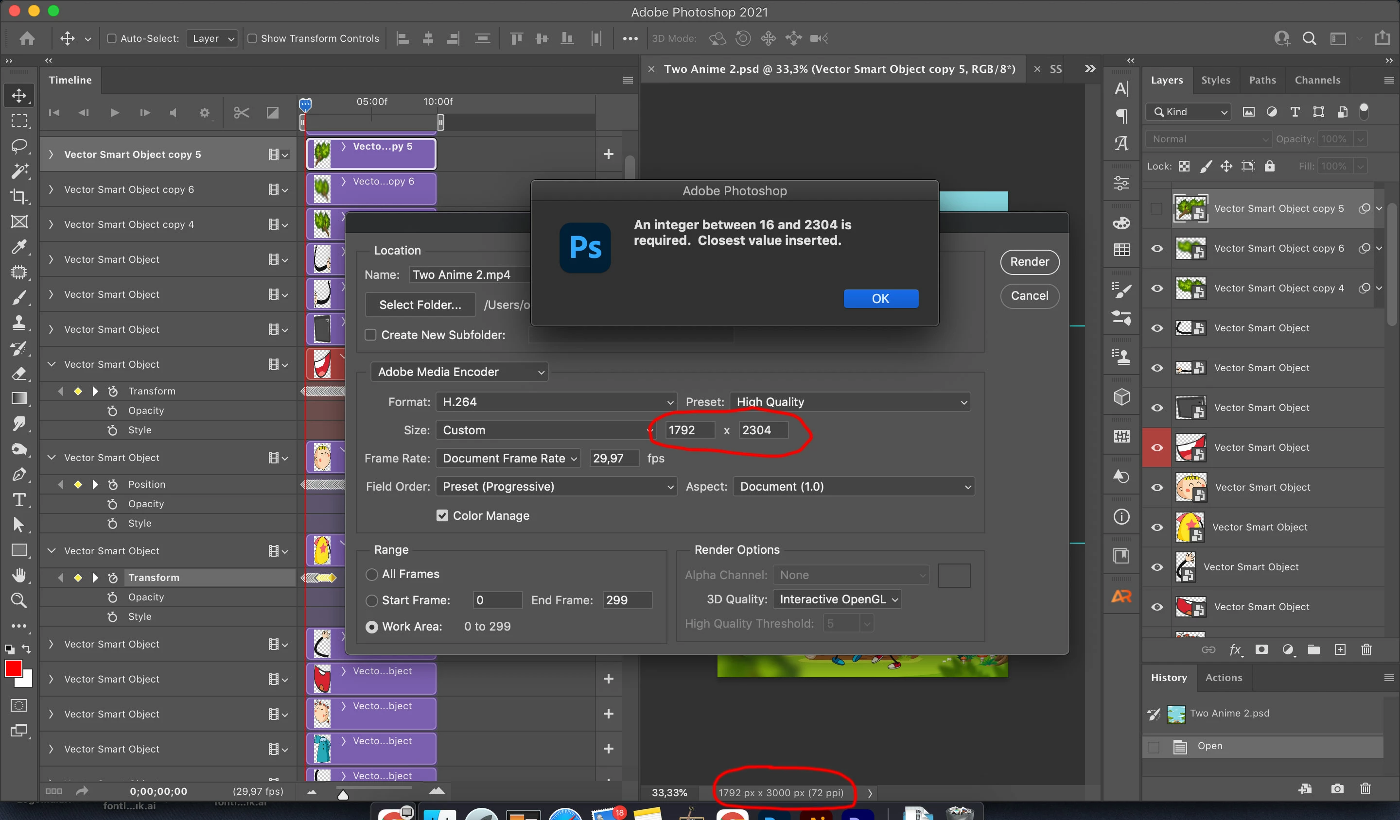 My document size is 1792x3000 but when i want to render a video, it shows me 1792x2304 and when i change it as 1792x3000, showing me warning dialog it says "