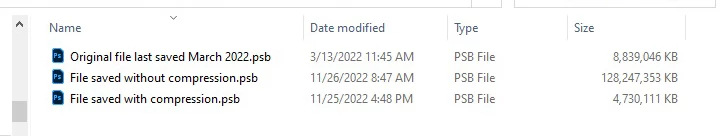 I just edited a 8 GB psb file in Photoshop version 24.0.1 that hadn't been touched since last March 2022. The edits were minor changes to text. When I resaved, the new file was 128 GB, a whopping 16-fold increase. Yikes! Neither the old nor the new file were compressed (and when the new file is compressed, it is only 4 GB). I'm using Windows 10 Pro.
