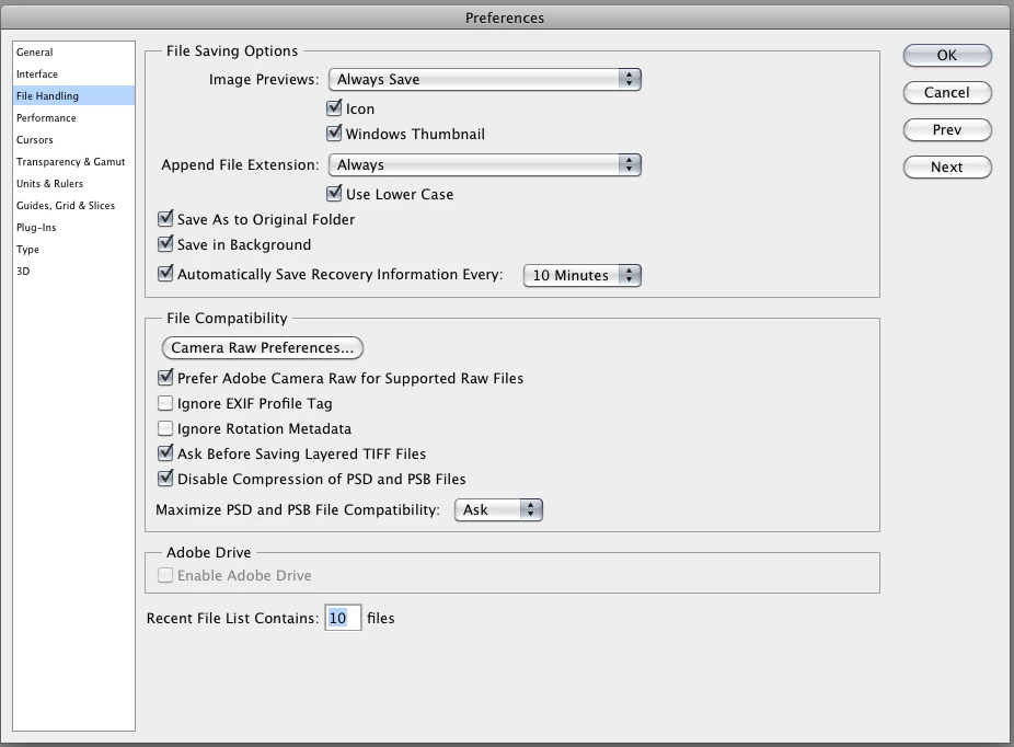 Saving multi-layered PSD or TIF files takes a LONG time compared to earlier versions of PS on the same computer. These are 8-bit, half a dozen layers, includes a few alpha channels, but nothing humongous. Original files are from a Canon 5Dmk2. For example, I saved a four-layer TIF, with one alpha channel, and it took 25 seconds to save. The final sized file size was only 27MB. In previous versions of PS, this saved in a few seconds at most. Layered TIF seem to take longer than PSD files. Below are my File Handling Preferences for PSCS6.