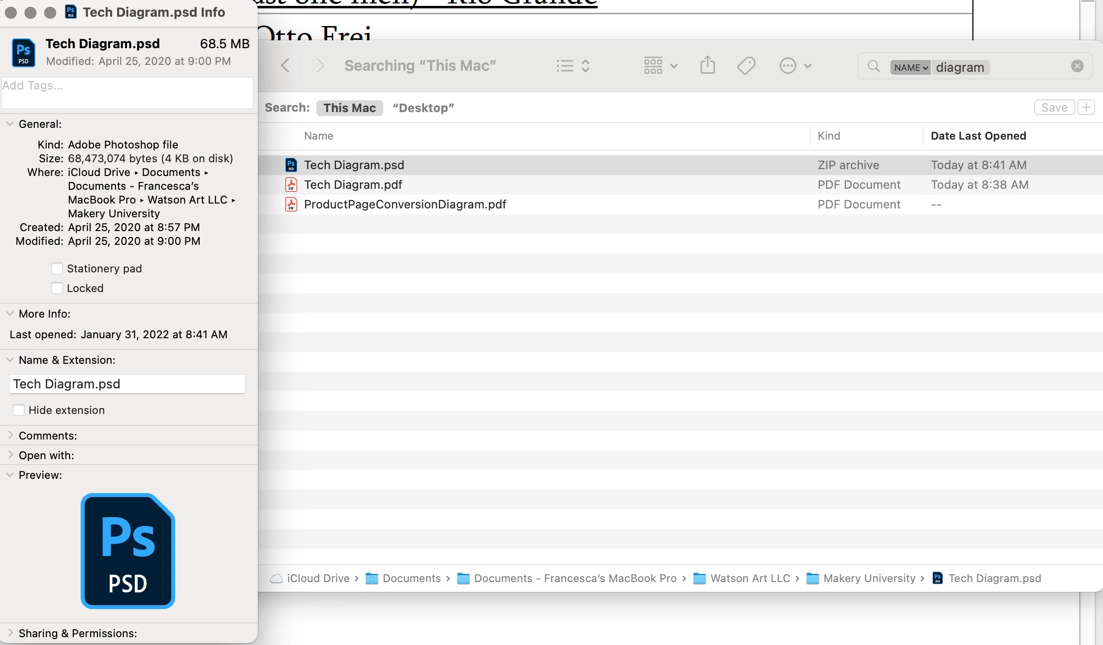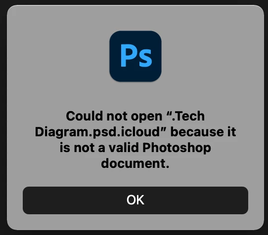 I've searched the forum and have not had any luck finding an answer. When opening an older .psd file (created probably 18 months ago), I'm getting an error message that it is not a valid Photoshop document. Attached are screenshots - the file information identifies the document as a Photoshop file. However in the "kind" column in Finder, it's showing the document as a ZIP file, and Photoshop is reading a .icloud extension that isn't evident in the file information. I'm really at a loss. Any suggestions about where to start fixing this?