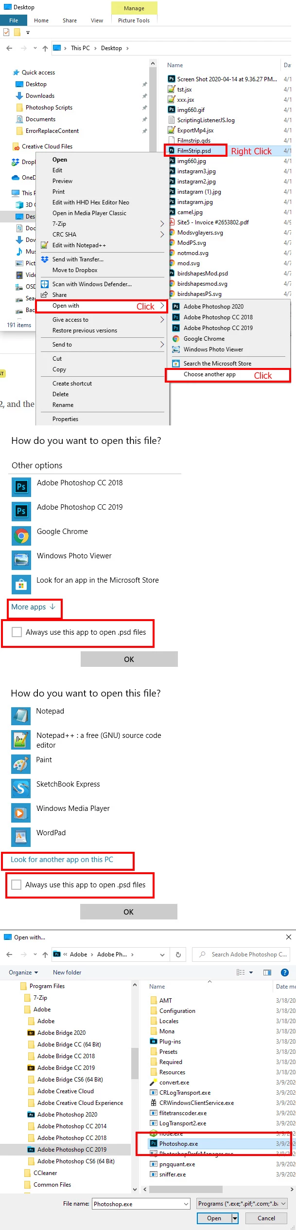 I am unable to open .psd file types using Photoshop 2020 (21.1), and I cannot seem to assign a default program for opening .psd file types. I tried every of the method provided in this post, but none of them work. I also tried uninstalling and reinstalling both Creative Cloud and Photoshop, deleting out all items in my Windows temp folders (C:\Windows\Temp and C:\Users\username\AppData\Local\Temp) before reinstalling, and this did not work. I had the same file associativity issue with one or more releases of Photoshop 20.0.