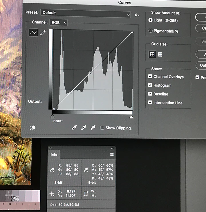 I've been asked to process of batch of scans. One of the things on the checklist is to "set the gray point". I'm wondering if I'm doing it correctly. What I do is open the Info panel, call up the "Curves" panel, select the middle eyedropper, then check the control strip in the image to find a middle-value gray that is exactly balanced, i.e. the R, G & B numbers are identical. Then I click that spot. (FYI, my eyedropper is set to a 5x5 sample). Is this the correct technique? What do I do with the images where I can't find a spot that is exactly balanced? This screen shot shows an example: there is no spot on the control strip that shows up as perfectly balanced in the Info panel.
