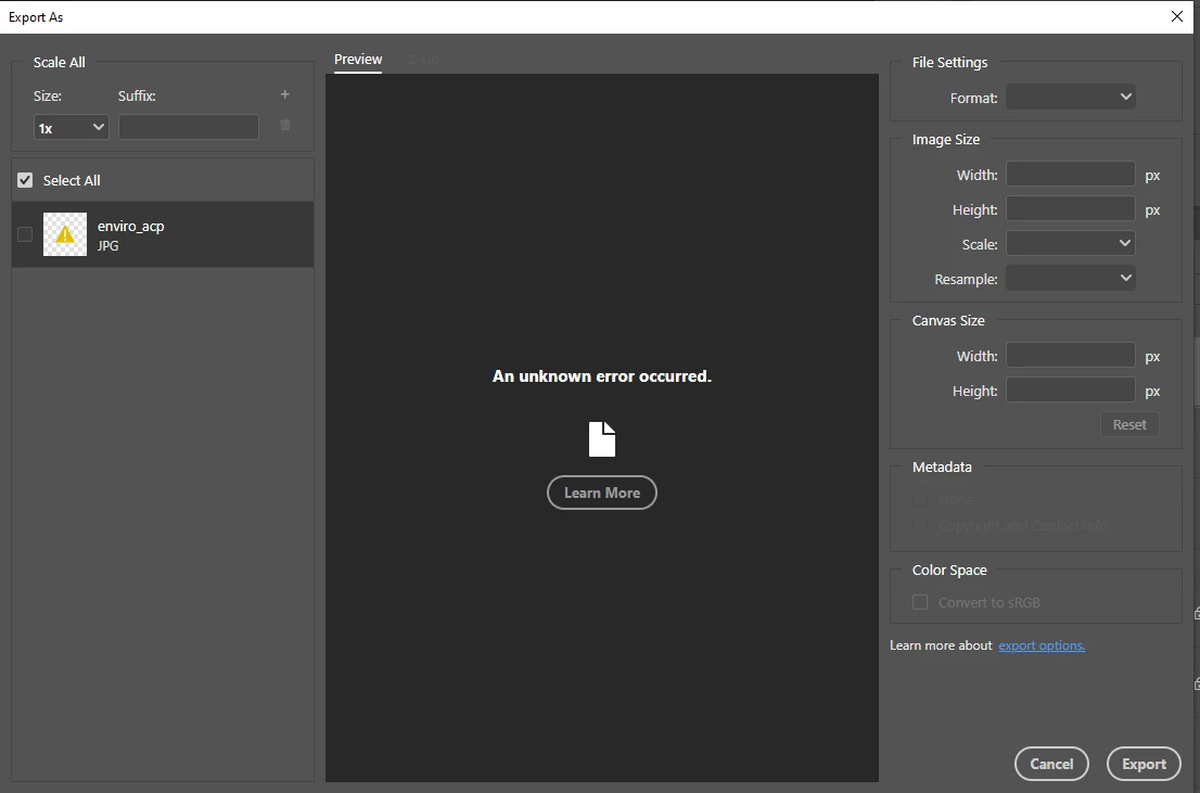 What happens is, no matter the size of my file, some of them can't be exported, which means when i export, no file is actually created. Although it is found in the quick access window of my files, no file is found when i click on it or go to its folder. When i try to do it via Export As, the window shows a yellow exclamation sign with a "Unknown Error - Learn More" tab.