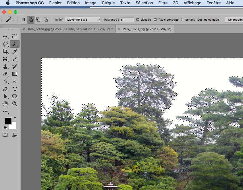 Yet the quick selection tool is not able to be dragged along that well demarcated horizon. It jumps into the city and will not "find" the pixel border between the different elements.