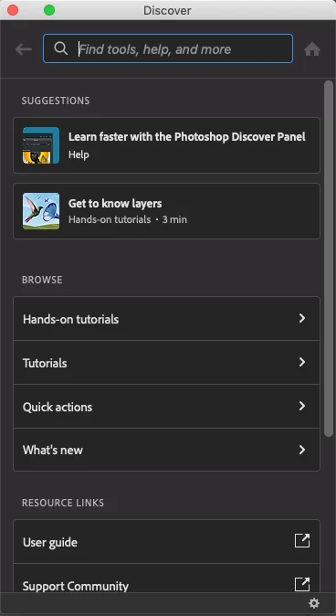 The in-app Discover Panel helps you find tools, tutorials, Quick Actions, and online help. You can search for information on any Photoshop topic and it will make suggestions as you type, often guessing what you are looking for before you are done. This is, however, more than just a search panel. There are also several other helpful options. The Tutorials and Hands-on tutorials are a great way to learn new skills. The What's new topic lists recently added features and the Resource Links area displays a ton of useful links. Give them a try to learn something new!