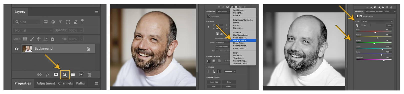 One quick and easy, non-destructive method for converting a color photo to black and white in Photoshop is to use a Black and White Adjustment Layer. Then, if you want to customize the look of your image, you can use a preset or adjust tones for each color with the sliders to create a variety of looks.