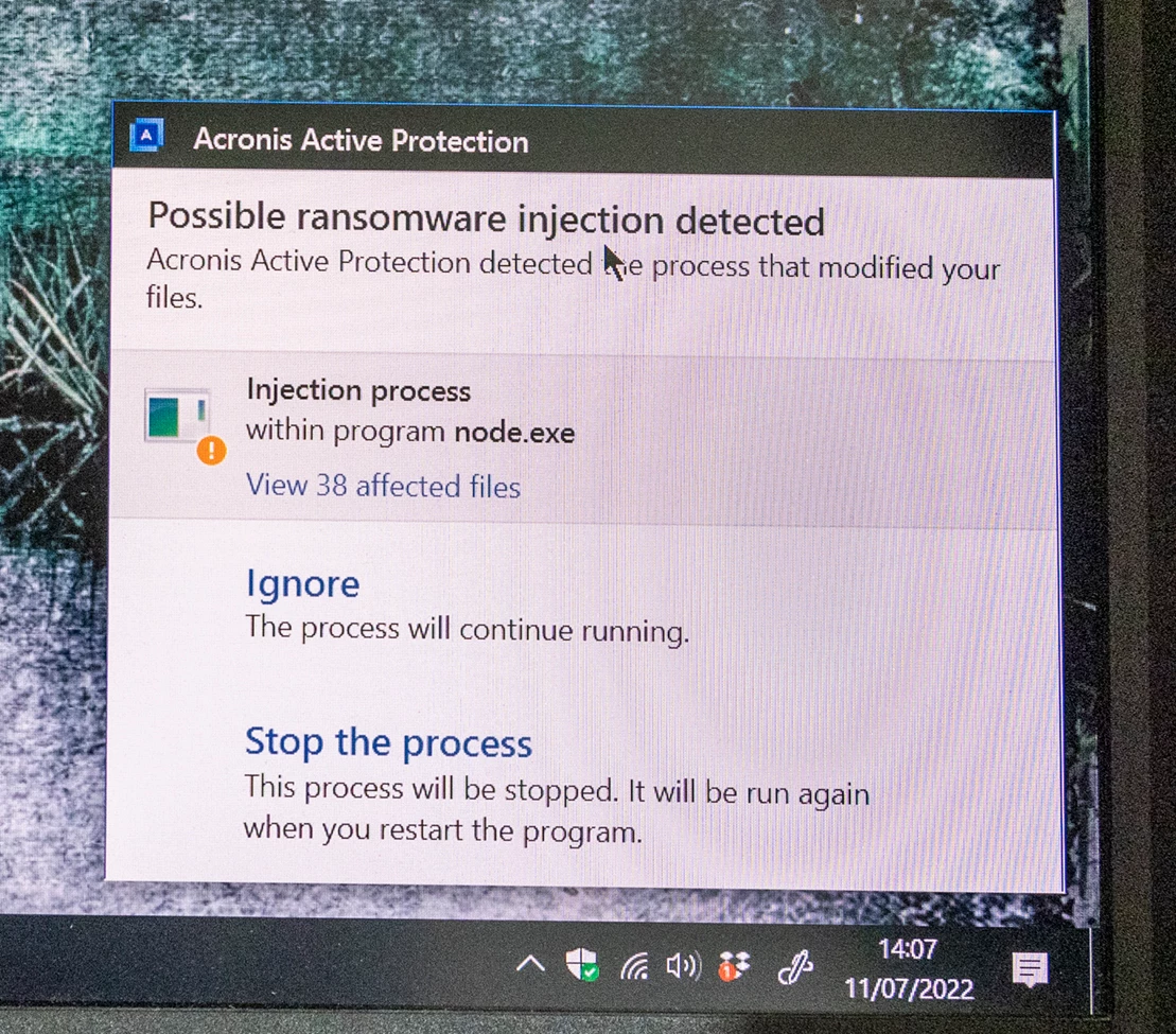 Recently I have been receiving a warning of possible Ransome ware injection by Acronis. See photo. After a search for node.exe which seems to be causing the problem, this item shows up in the logs attached as being linked to Photoshop.
