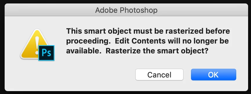 "This smart object must be rasterized before proceeding. Edit Contents will no longer be available. Rasterize the smart object?" and then a cancel and ok button