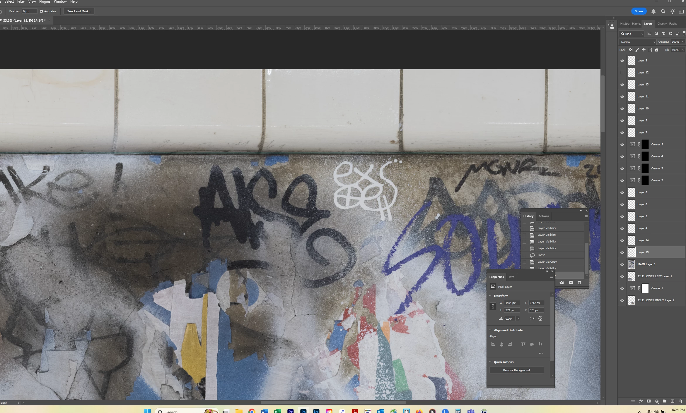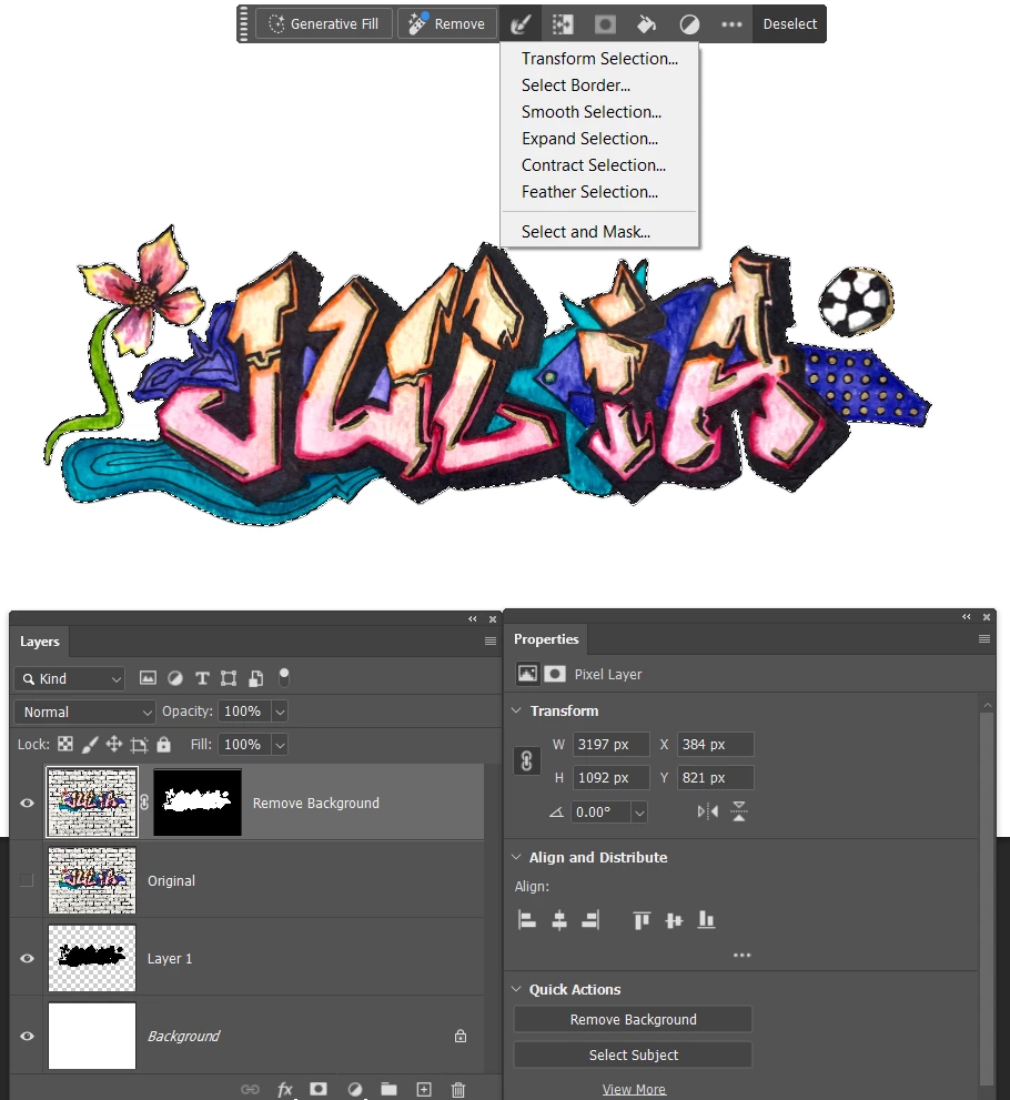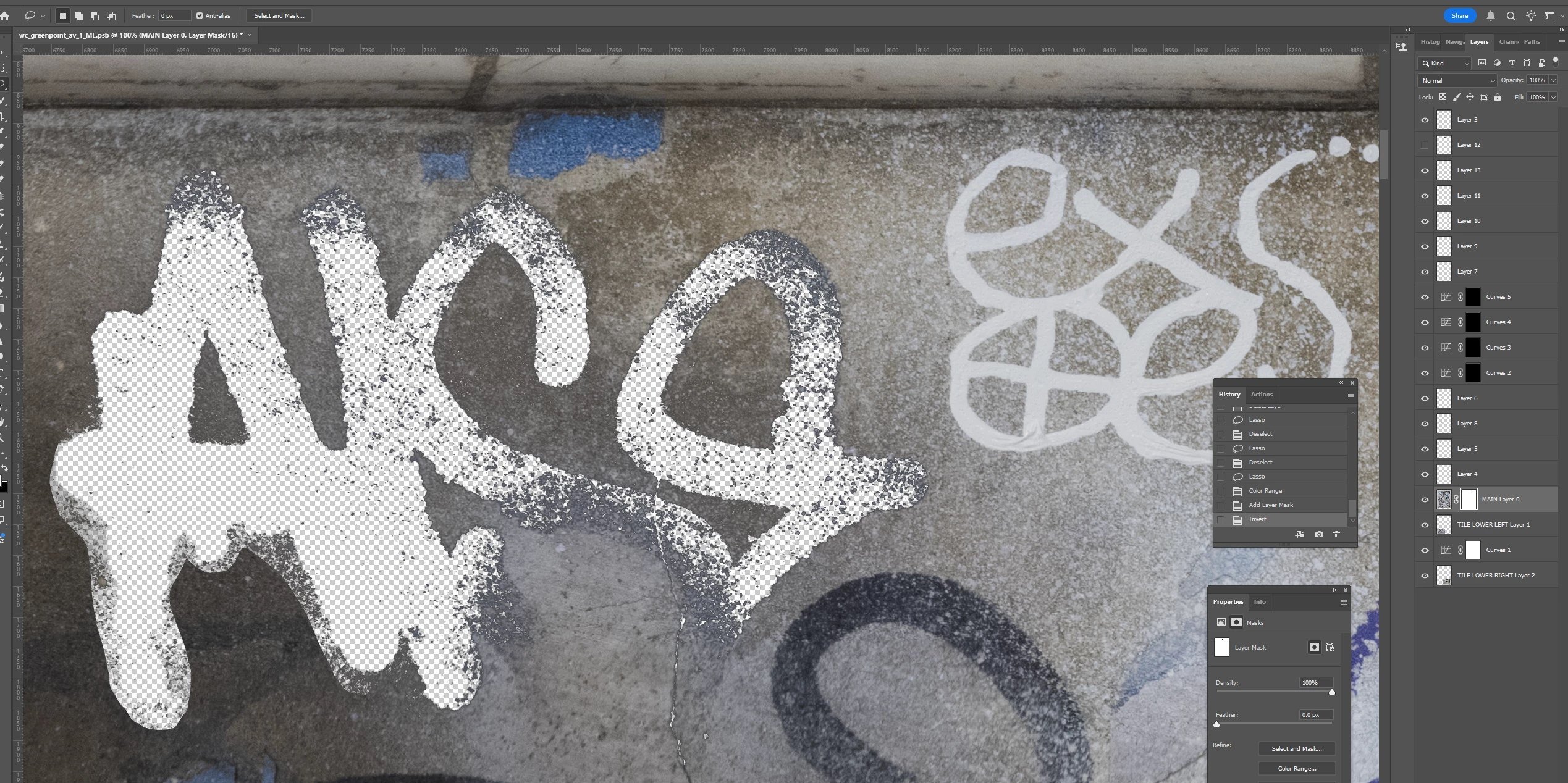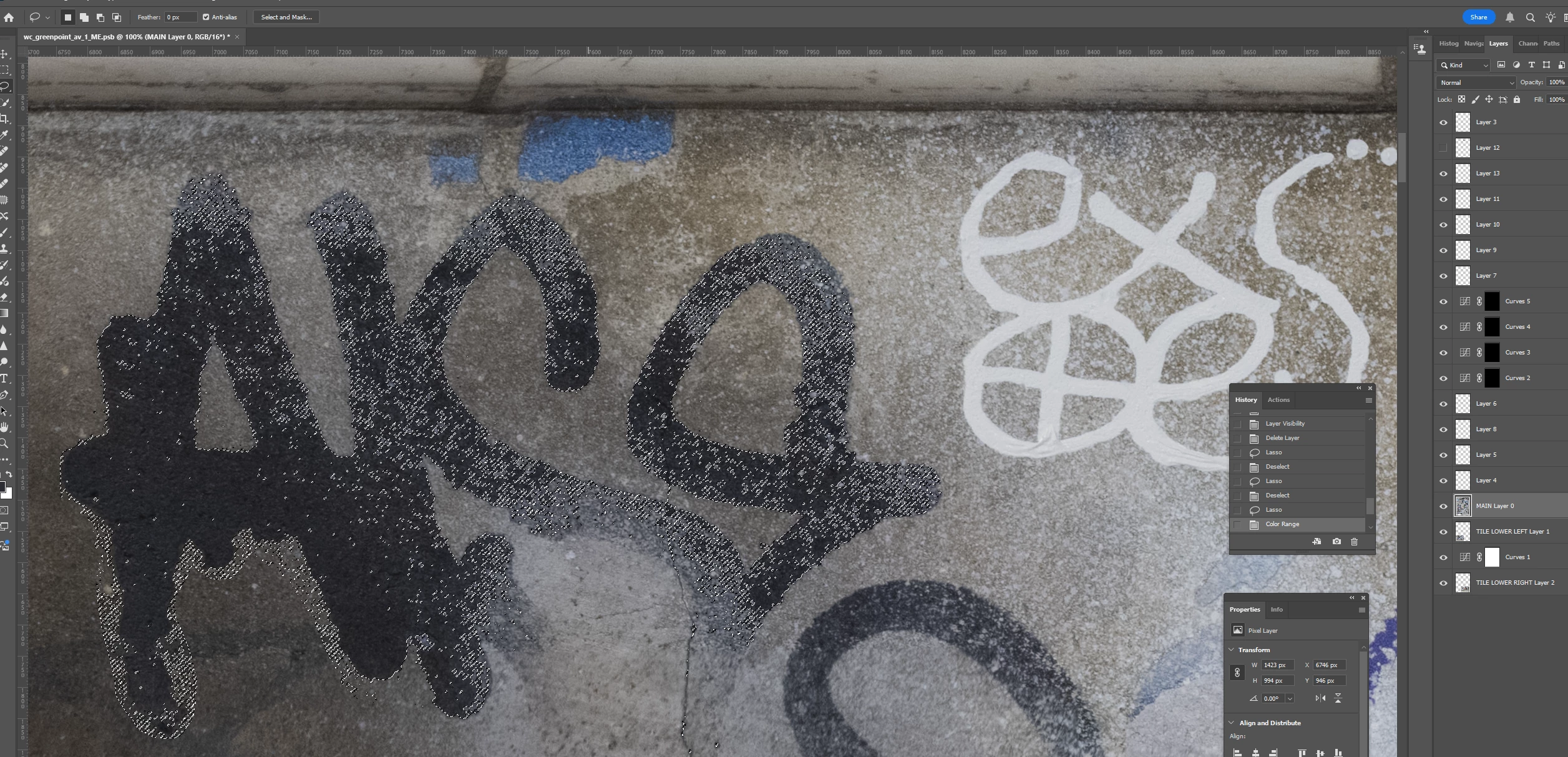 I lassoed a section of graffiti and used Select>Color Range to select the graffiti. I’m assuming I need to make my selection of graffiti (1) its own layer and (2) transparent in the main layer because otherwise pixels might appear through the Blend If layer. But since completing the actions for both results in a deselection of the graffiti, I don’t know how to achieve both. Put another way, it seems I have to go back in my History to access the selection, but that undoes the action of either creating the Layer or masking the selection in the underlying layer. I hope this is clear.