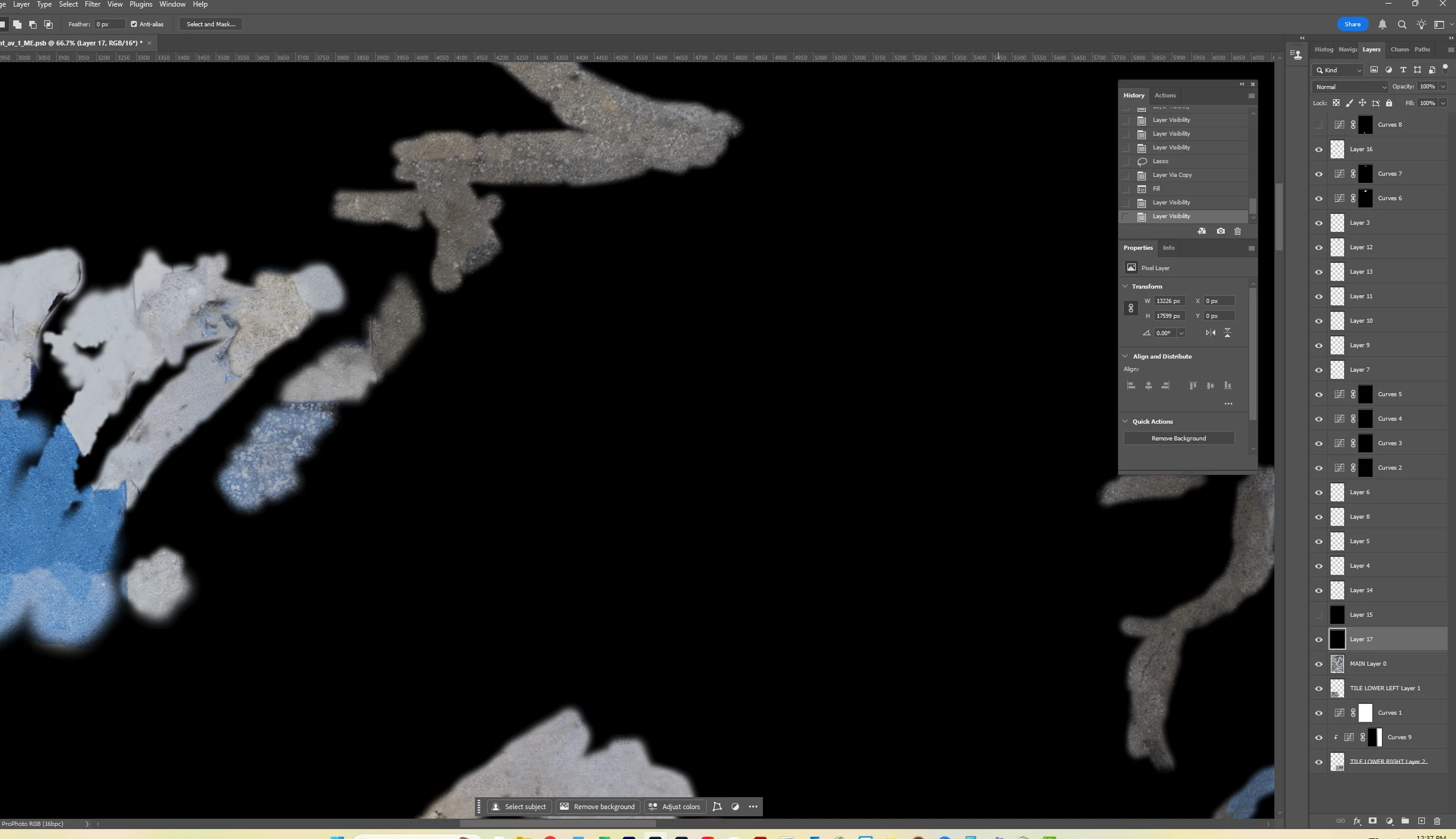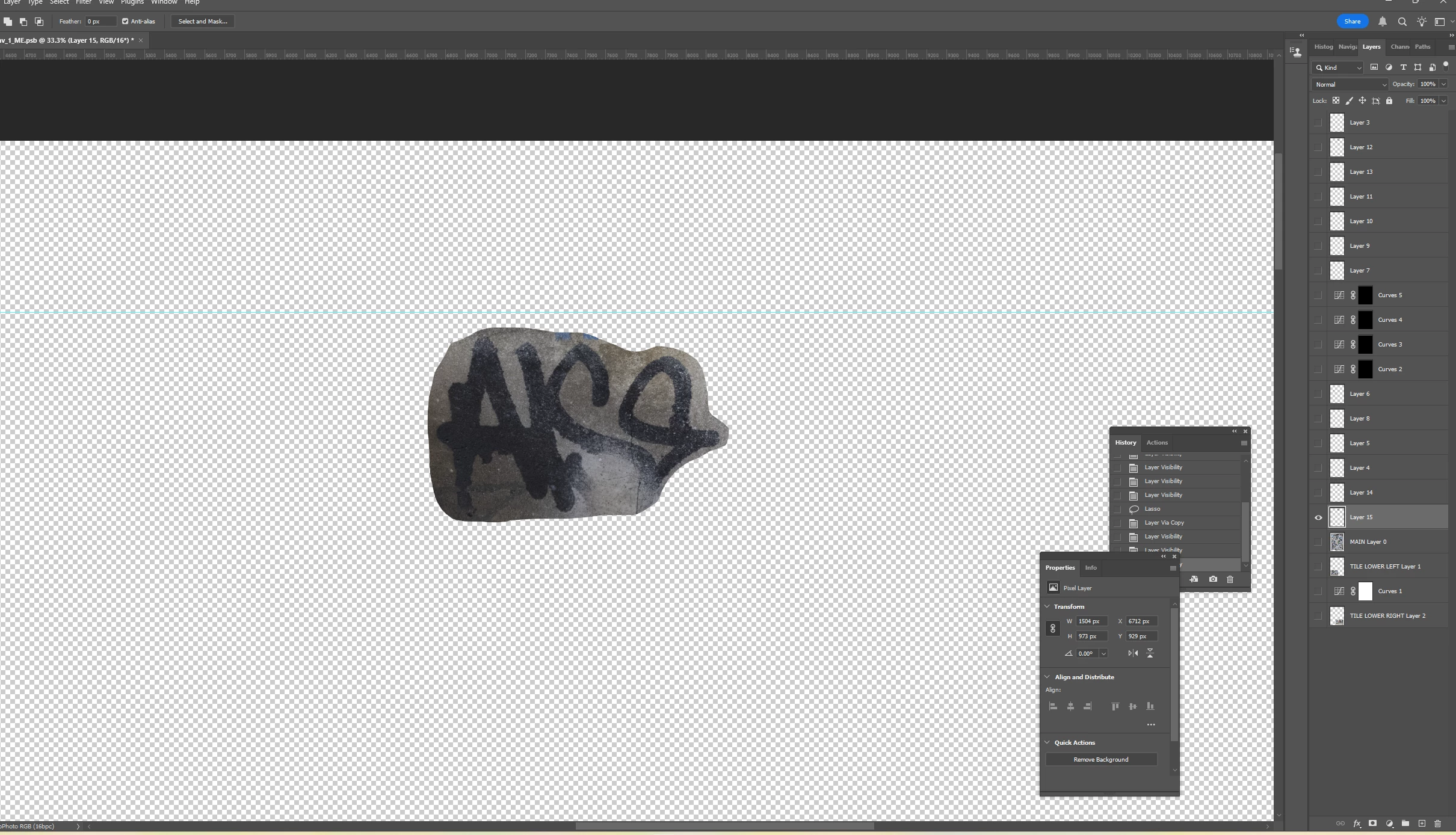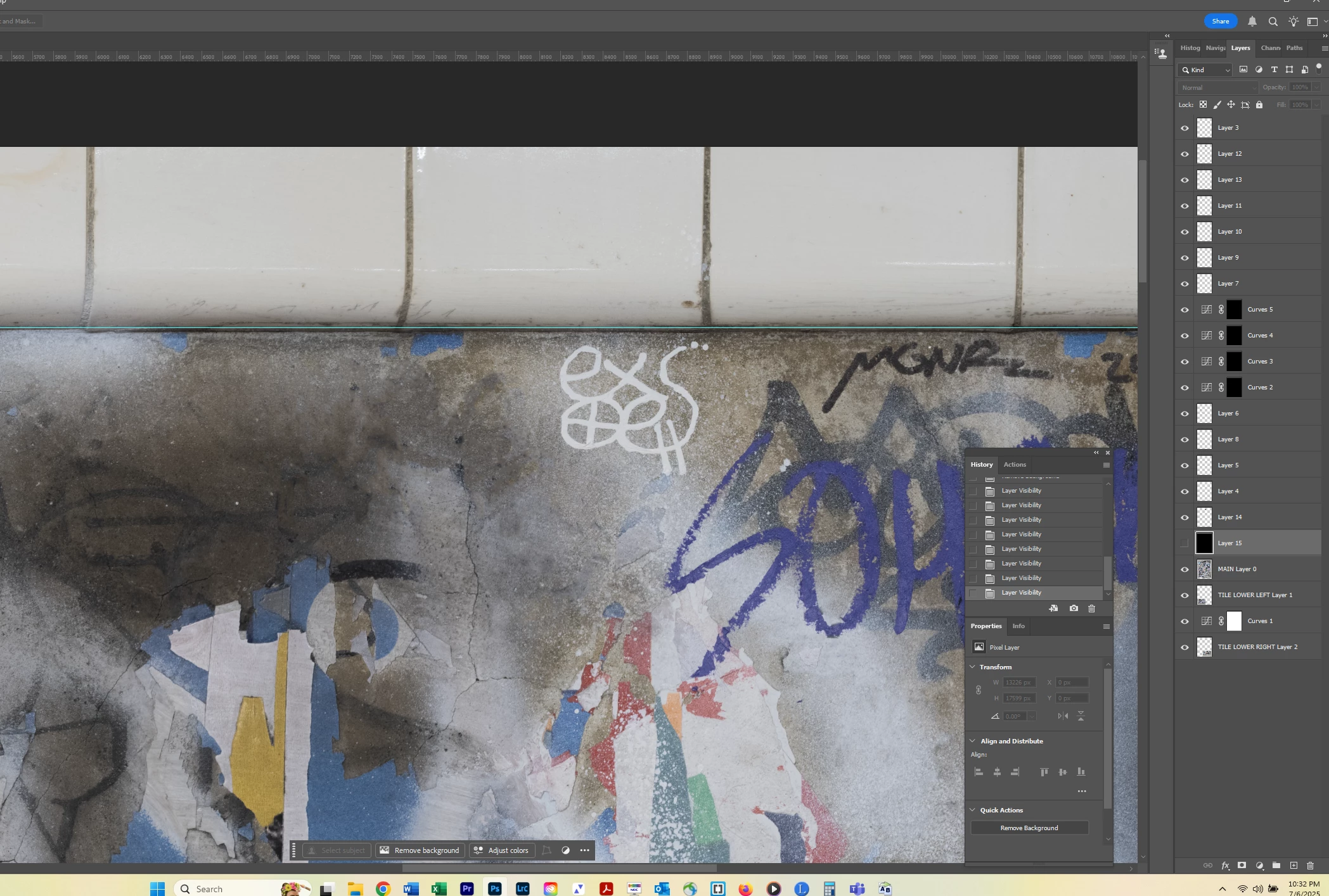 I lassoed a section of graffiti and used Select>Color Range to select the graffiti. I’m assuming I need to make my selection of graffiti (1) its own layer and (2) transparent in the main layer because otherwise pixels might appear through the Blend If layer. But since completing the actions for both results in a deselection of the graffiti, I don’t know how to achieve both. Put another way, it seems I have to go back in my History to access the selection, but that undoes the action of either creating the Layer or masking the selection in the underlying layer. I hope this is clear.