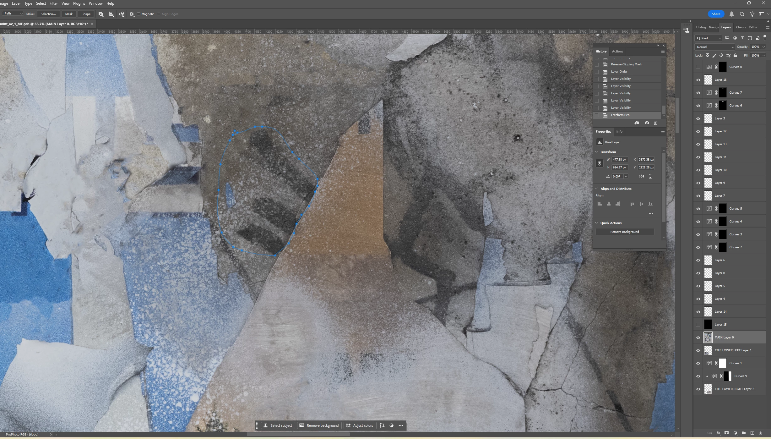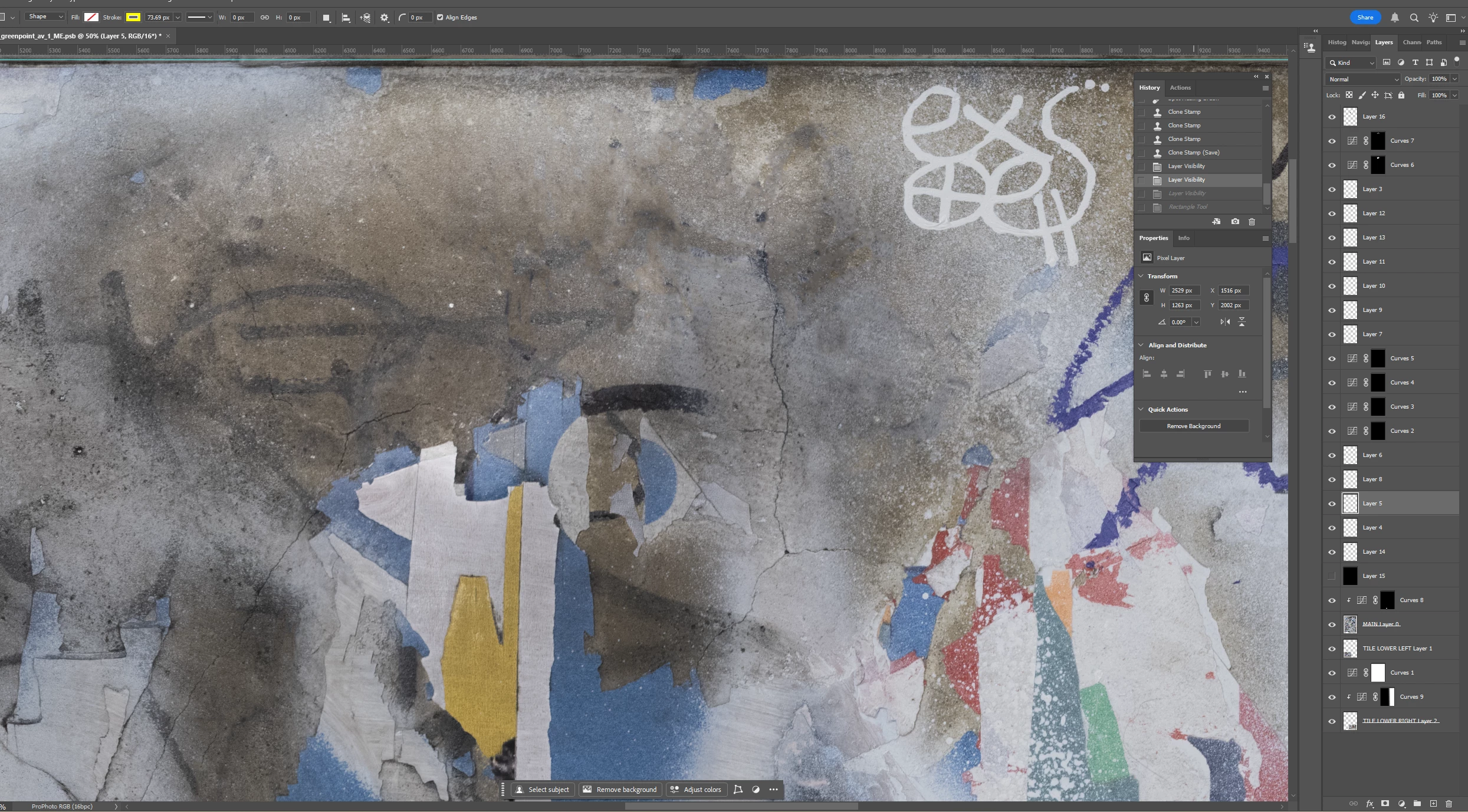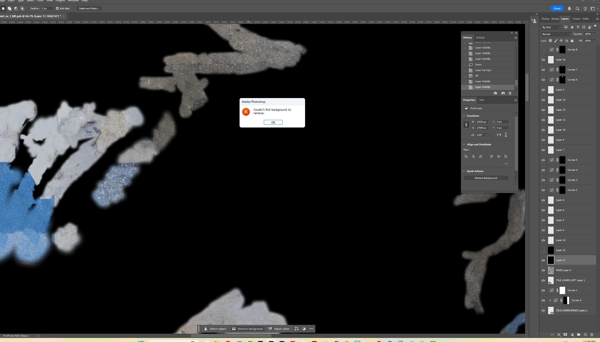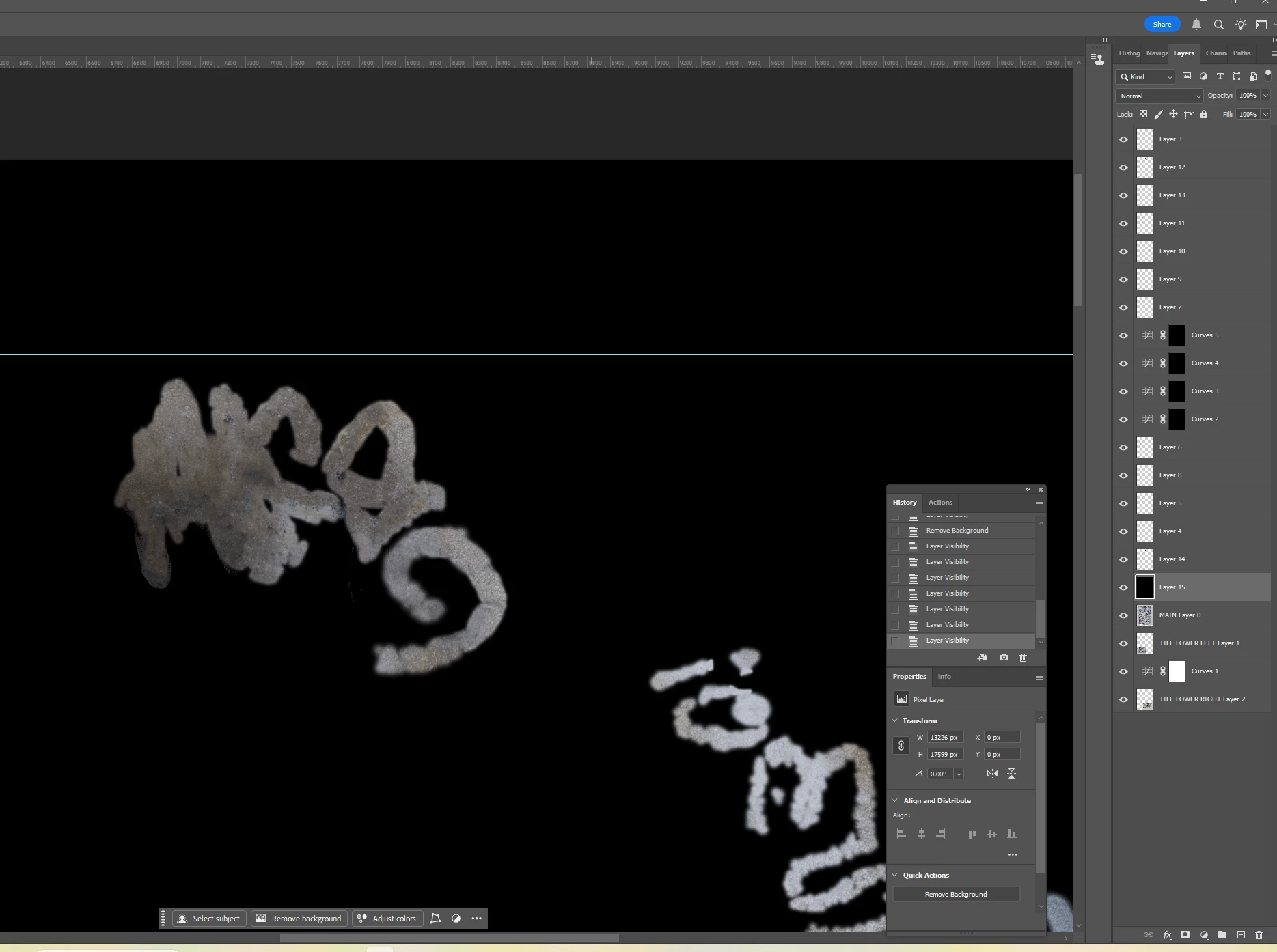 I lassoed a section of graffiti and used Select>Color Range to select the graffiti. I’m assuming I need to make my selection of graffiti (1) its own layer and (2) transparent in the main layer because otherwise pixels might appear through the Blend If layer. But since completing the actions for both results in a deselection of the graffiti, I don’t know how to achieve both. Put another way, it seems I have to go back in my History to access the selection, but that undoes the action of either creating the Layer or masking the selection in the underlying layer. I hope this is clear.