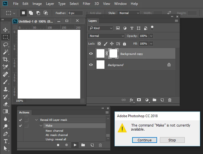 I am receiving an error message stating The command "Make" is not currently available. I have a new laptop using Windows 10. I was previously on Windows 7. I upgraded to the latest version of Photoshop CC(Release 19.0) however reverting back to previous available versions has made no difference. I had no issue prior to upgrading my laptop. I appreciate any help that you can provide.