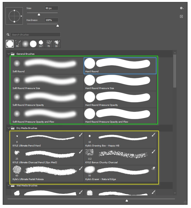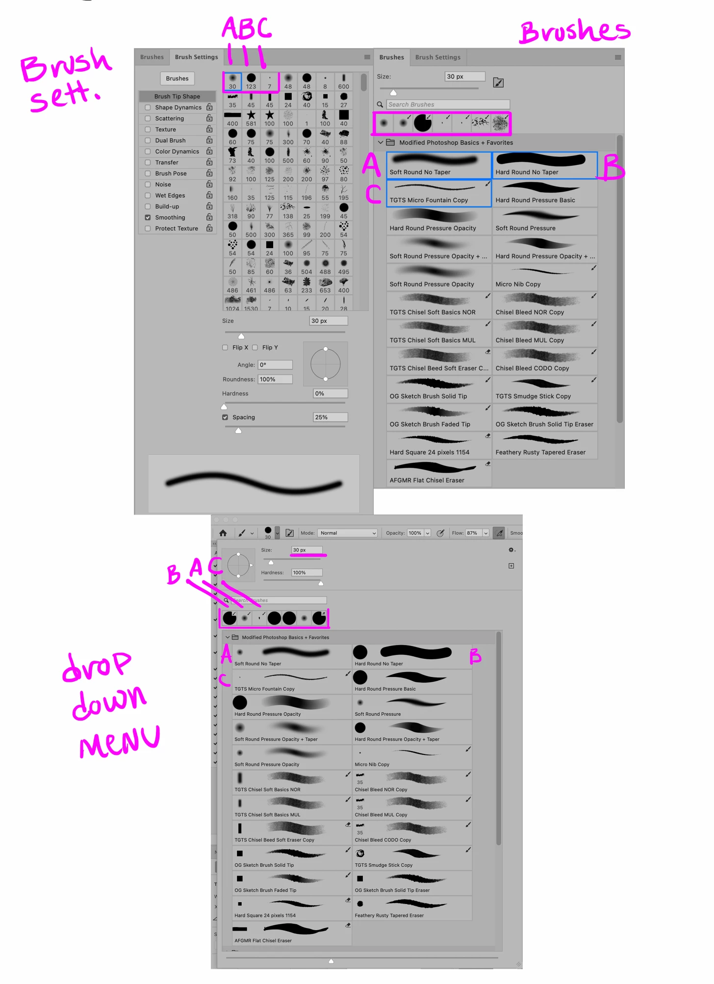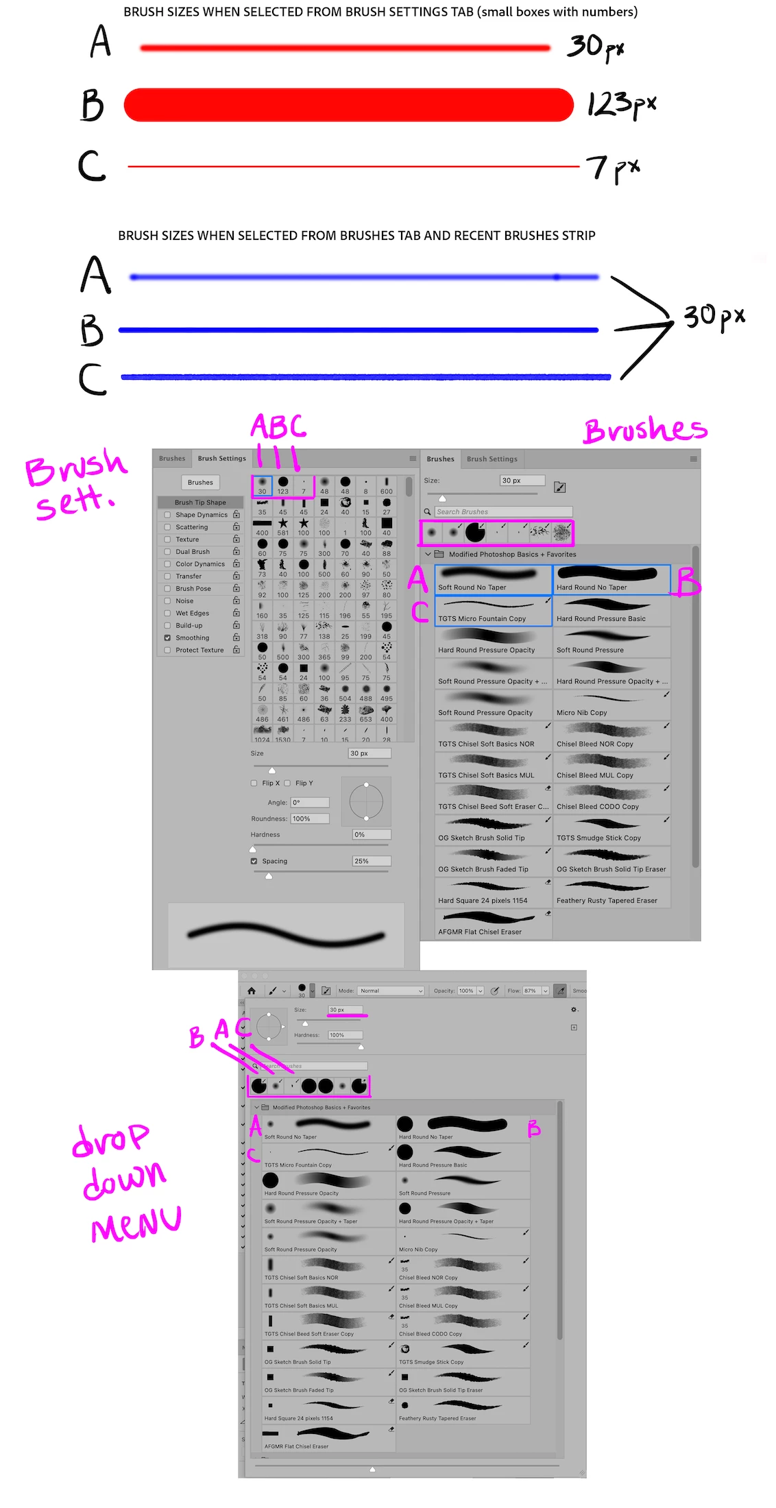 Currently, the strip (misleadingly) still visually reflects the size that each recent brush was at before switching to a different one. However, now when I switch from A to B, it remains the same size. In the example, when I switch from A to B, B's new size is 10 px. Same as A. Because of this, whenever I switch between different recent brushes, I have to resize them manually Every. Single. Time.