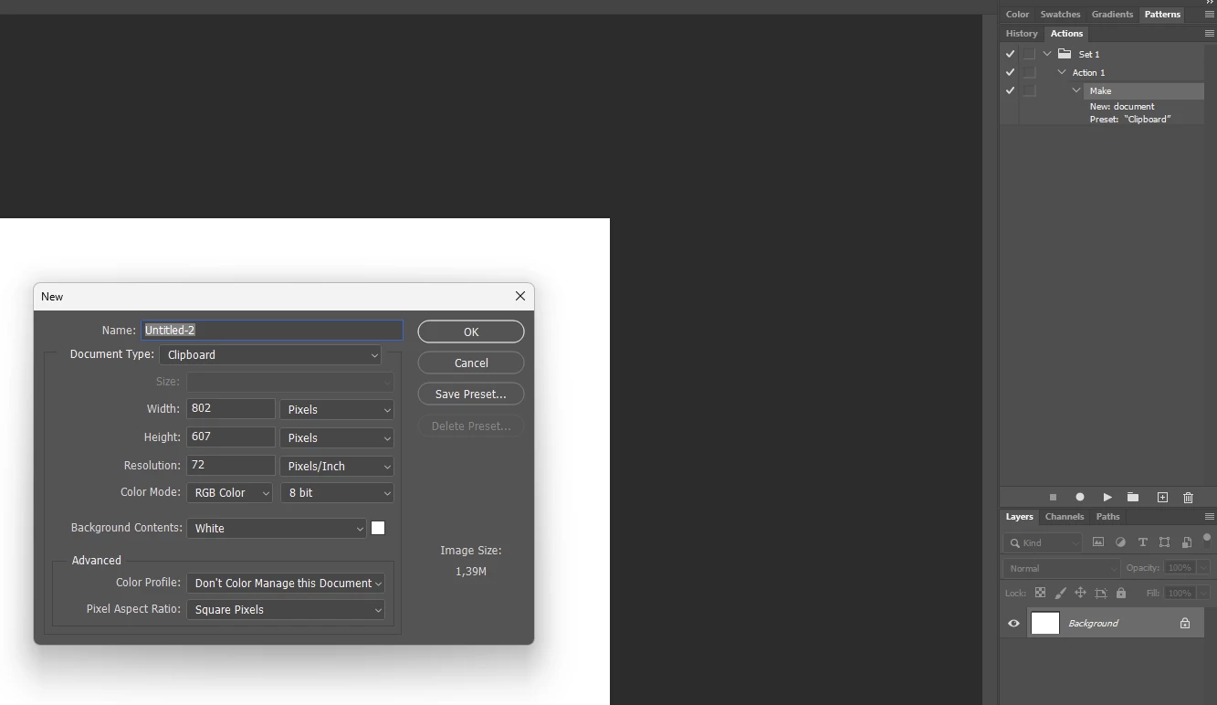 In the new photoshop (version 26.9.0), I am no longer able to record an action with making a new document using preset "Clipboard". Photoshop now records the exact dimensions instead of the clipboard preset.