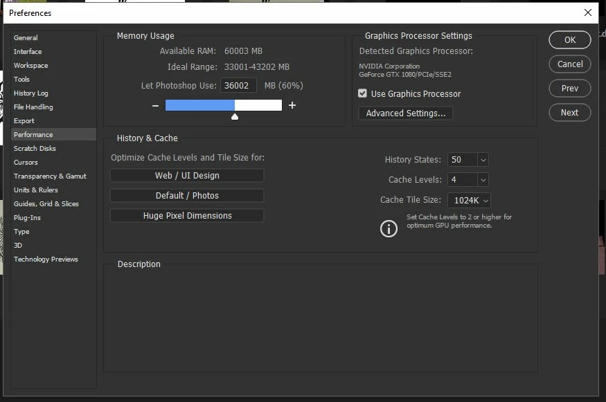 As you can see, I have 64gb of RAM and although PS states it's using 60%, the system reports PS using only 20%. Also, you will note each 1080 has 8gb of RAM.