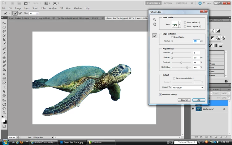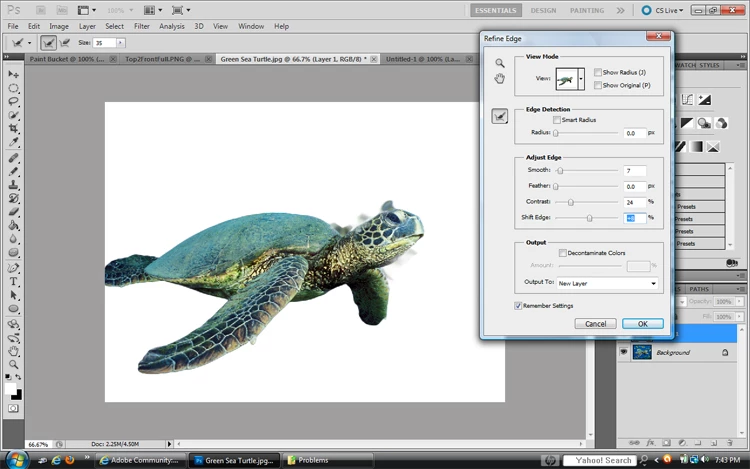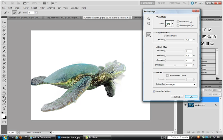 My refine edge tool has stopped working properly.  Rather than refining my edge selection, it sort of blends my selection into transparency, making the final product look extremely sloppy (the point to be made here is that the tool does not funciton as it does on tutorials and examples).