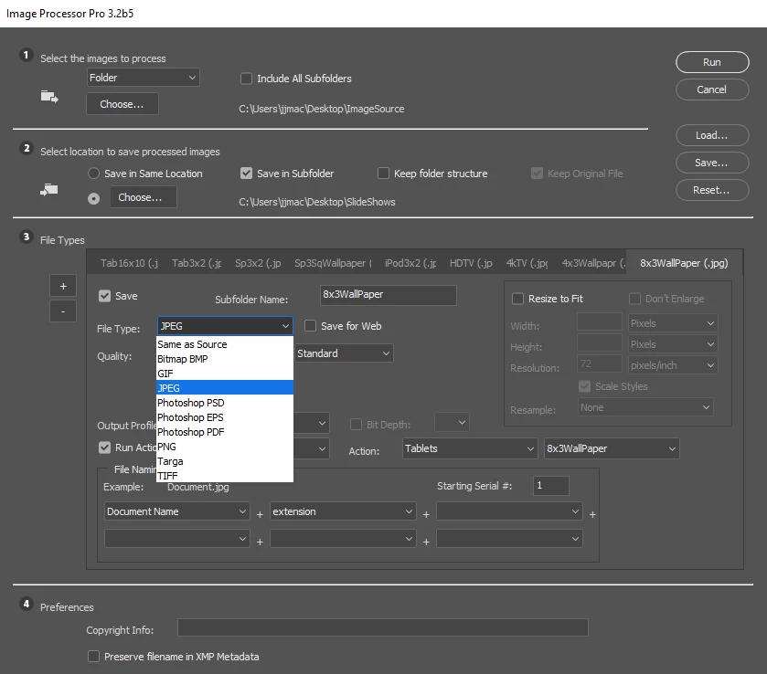 The image processor Pro can save up tp 10 files for each file processed and use 10 different actions and actions can play other actions several file formats are supported.